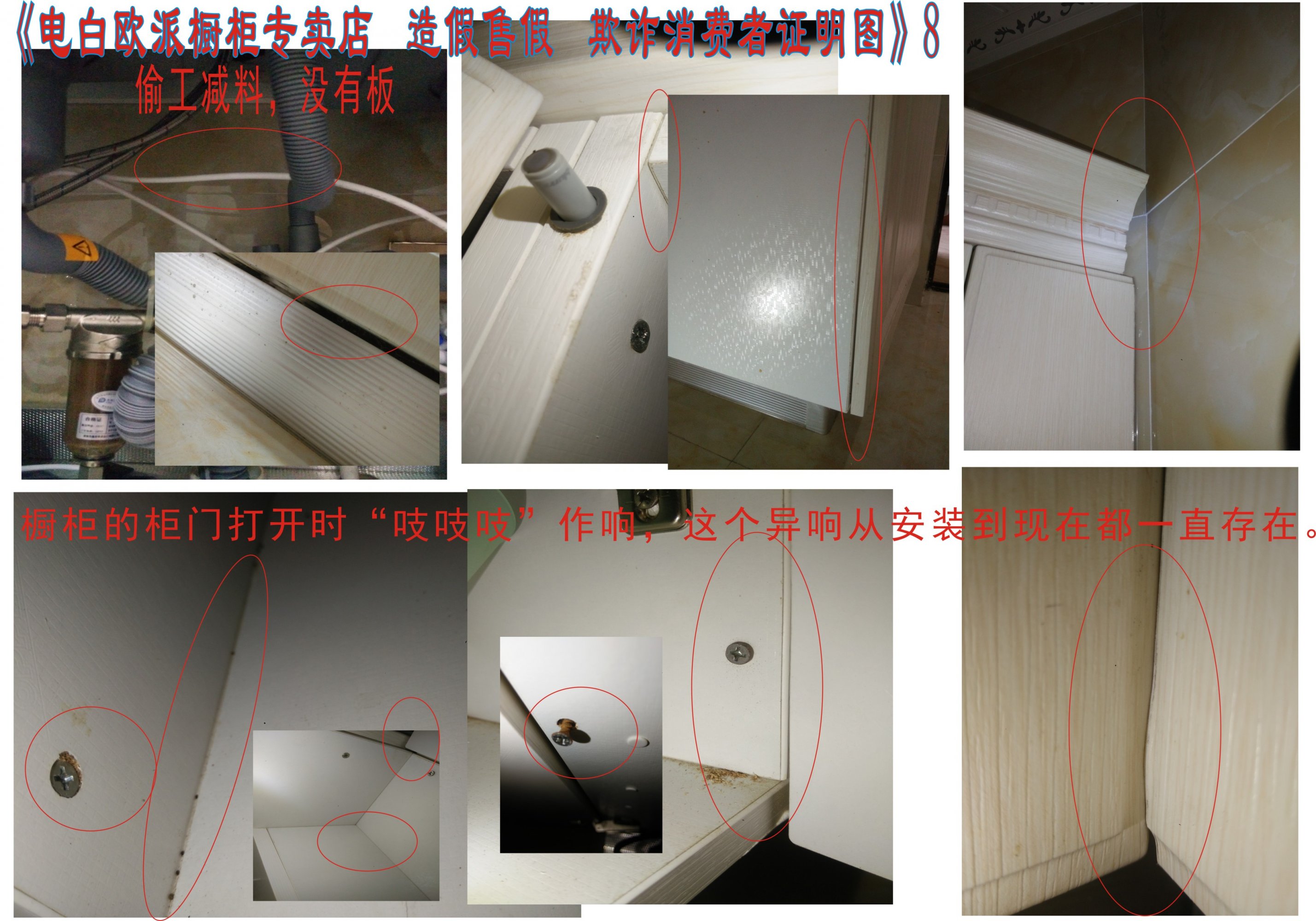 其实还有更多的小毛病本人没有一说出,欧派橱柜你严重影响到我家的生活,而且也欺骗了我欧派橱柜有的品牌档次,要本人花了2万5千多,定制了一个在街边小店几千块就可以达到比欧派橱柜好效果的更多橱柜,这些本人也在小区邻居做过对比。欧派橱柜从售前一开始就是用各种圈套欺骗方法在做营销,货不对板,以假乱真,以次充好,售后推托,完全一副店大欺客的模样!!!!