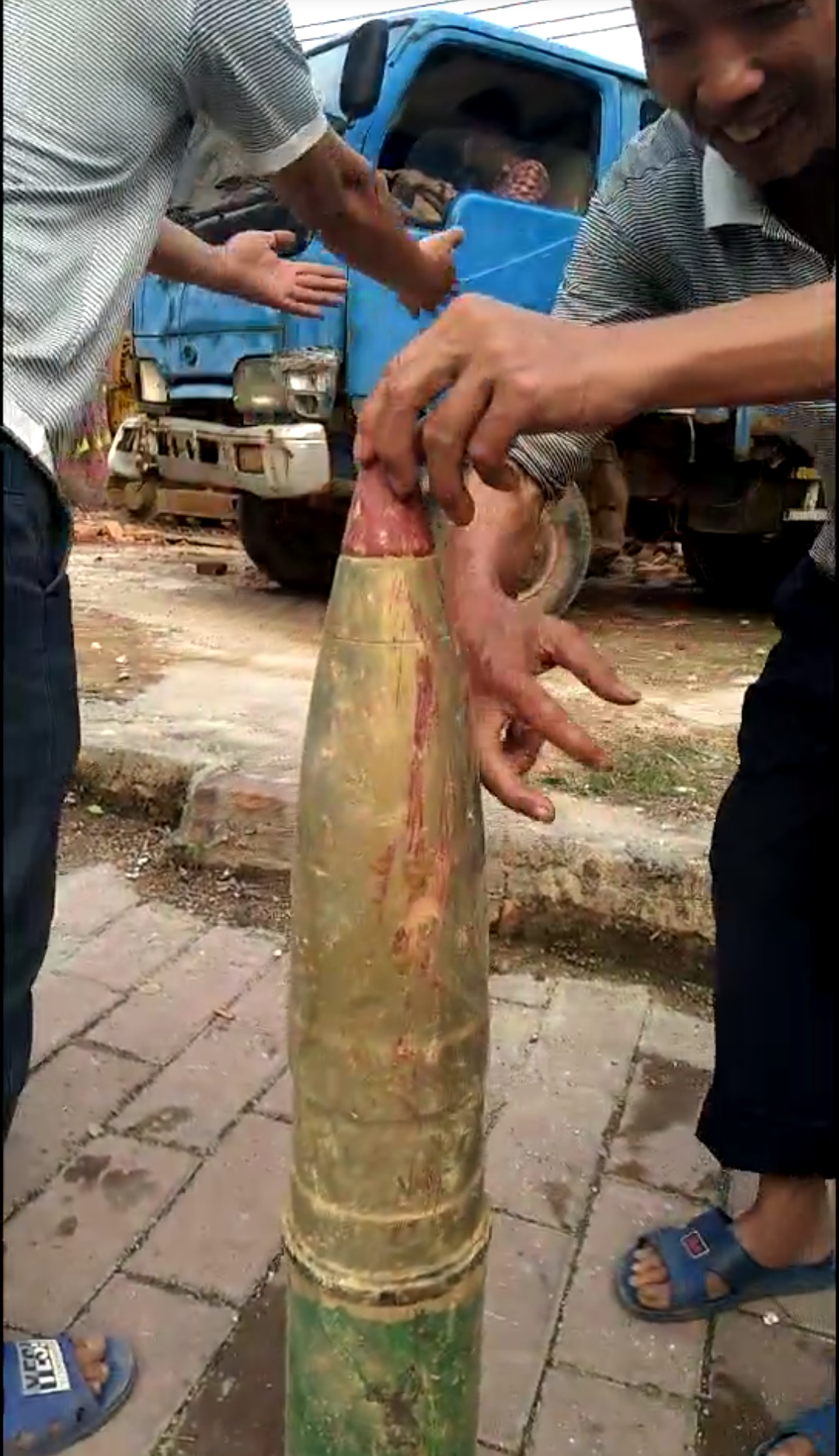 山人兄只知其一不知其二,在这里我被大家补充点点。这确实是赵陀时期的产物,但它不是什么弹,也不是什么法器。这只是一种厨房用具,查看史料有明确记载,南越王国第二代王赵眜(赵眜是赵陀的孙子,号称文帝)西汉初年到粤西狩猎抓鱼摸蟹游玩时携带至电白的,资料上当时还没有水东这个地名。因沿海地区的人有喝粥习惯,赵王听说白粥配橄榄盐特别美味所以才带来这种和面棒,专门用来钟撞橄榄盐。皇室使用的东西是做得非常华丽精美的,无不透露着权利的象征,这根和面棒造型粗大,从头到尾分别采用红金绿三种颜色,寓意为福禄寿。据考证,此弹为赵陀南征的遗物!我在三个月内为广隆岭培养三个老太太来讲赵陀留此弹的故事,很快广隆岭就成为旅游胜地!砖家必能证明中国在秦汉已能制造炮弹——为什么后来失传,等我进一步编造历史!