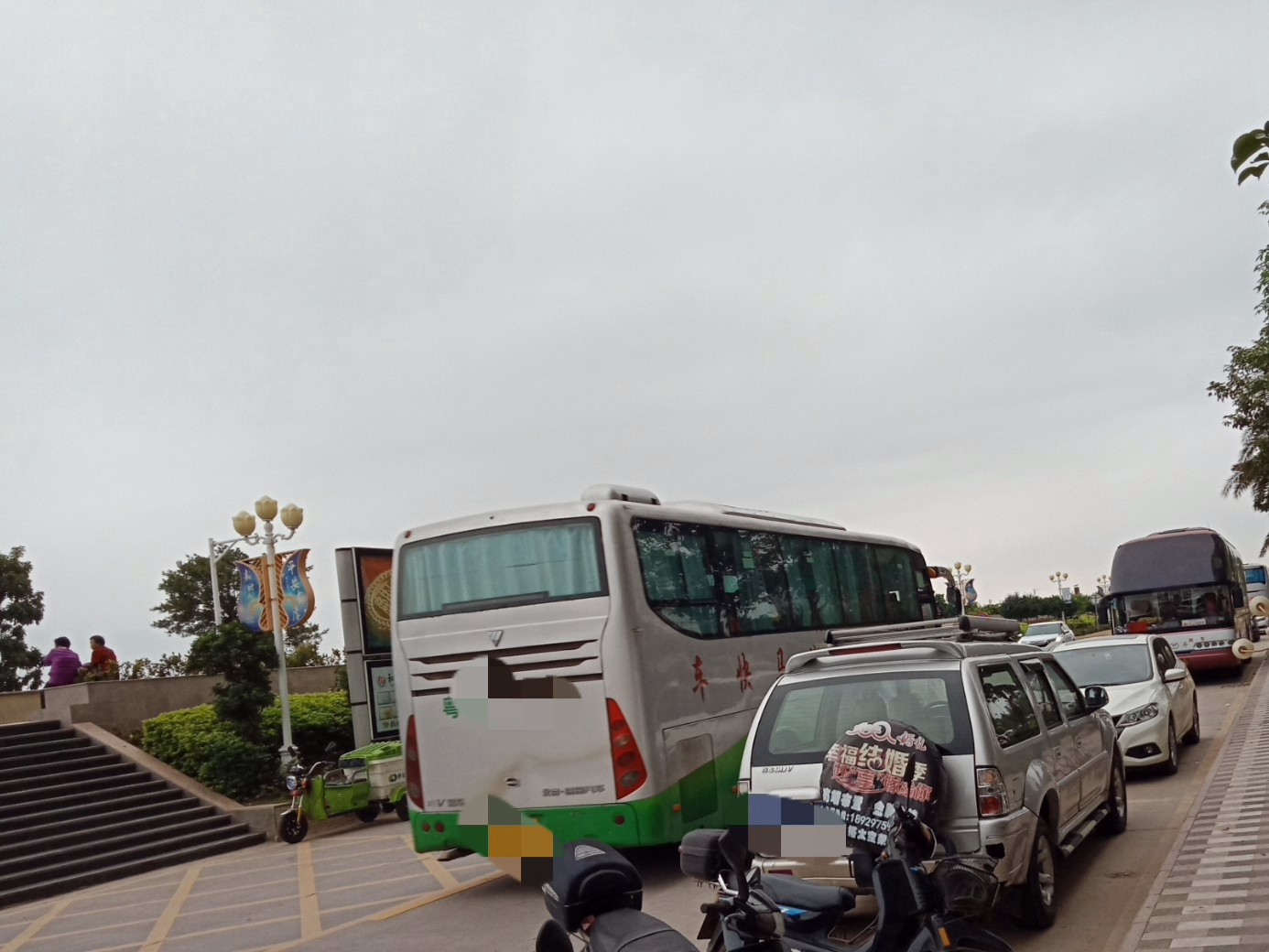 分外批次,有些早来,有些晚点来,来早的,玩早也就早去下一更好景点~有粤ⅹ粤s粤E粤k等~木见桂等地牌~中午时分没空,不知有没有~而下午5点几钟去吸吸有兩辆粤G牌与辆粤K大巴~还有好些外地牌的自驾车的~