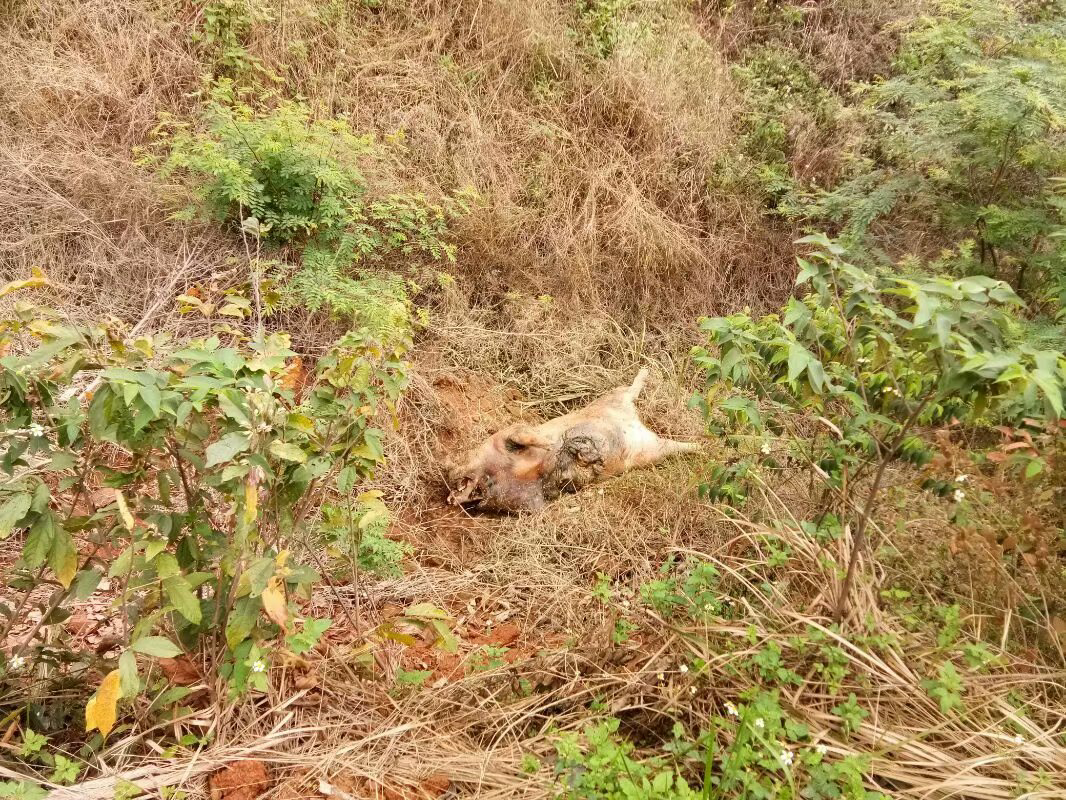 从金凤村委会凤尾村向前走,是一条单向的水泥路,每隔一段距离,都有一盏路灯,但到了能清楚地看见茂名技术职业学院这所末流大学时,即竖立着牛腿山村招牌这个地方,我发现这里长达好几十米的渠底野草丛生,水源干涸,一股浓浓臭味熏鼻而来,我寻找臭源,只见相距不远处,两只已鼓胀,肚子绽开的肥猪有一只四脚朝天,一只侧睡,乌蝇嗡嗡,令人作呕,有两个一男一女的农民同胞看见我在拍照,便在我面前停了下来,他们异口同声地说:“前三天,有人抬一只足有300多斤的死猪去石坳丢放……应该深埋不深埋。”乱丢死猪,不愿深埋,说明养猪户缺德……如今实行河长制,不知道这段共青河是否属于河长制的管理范围?