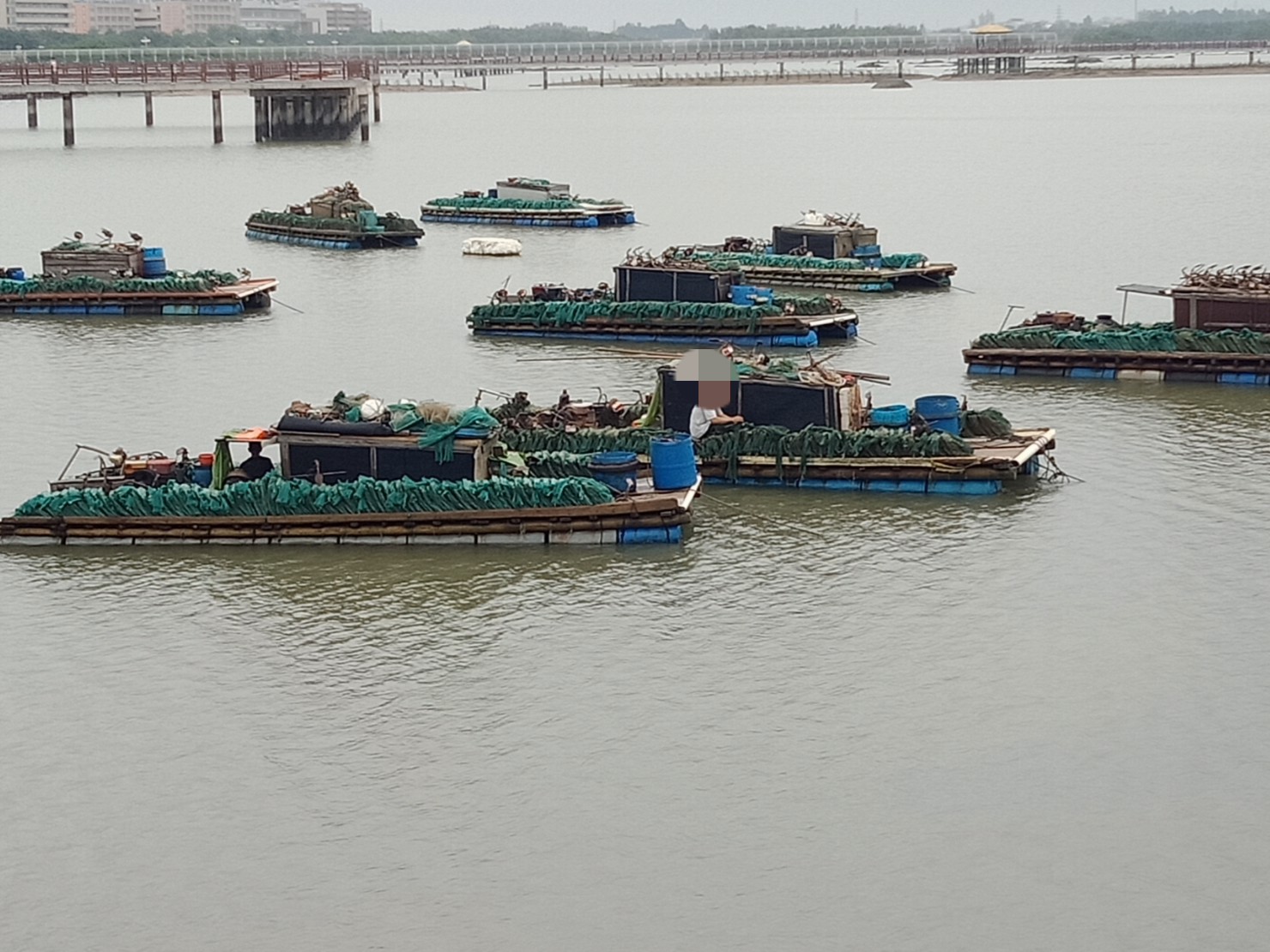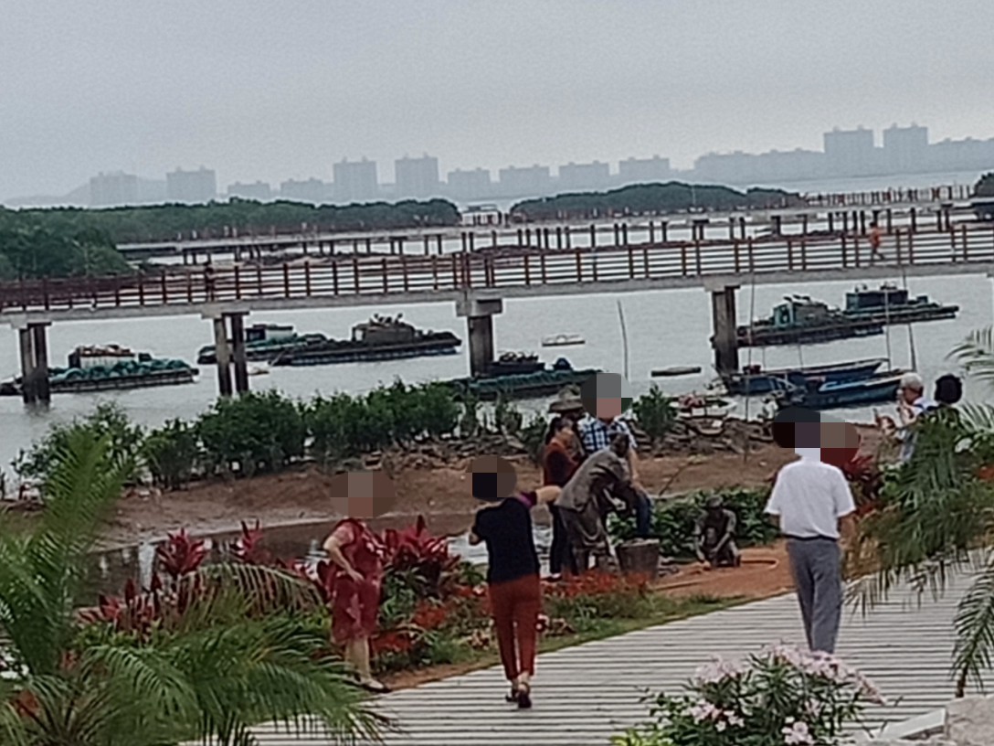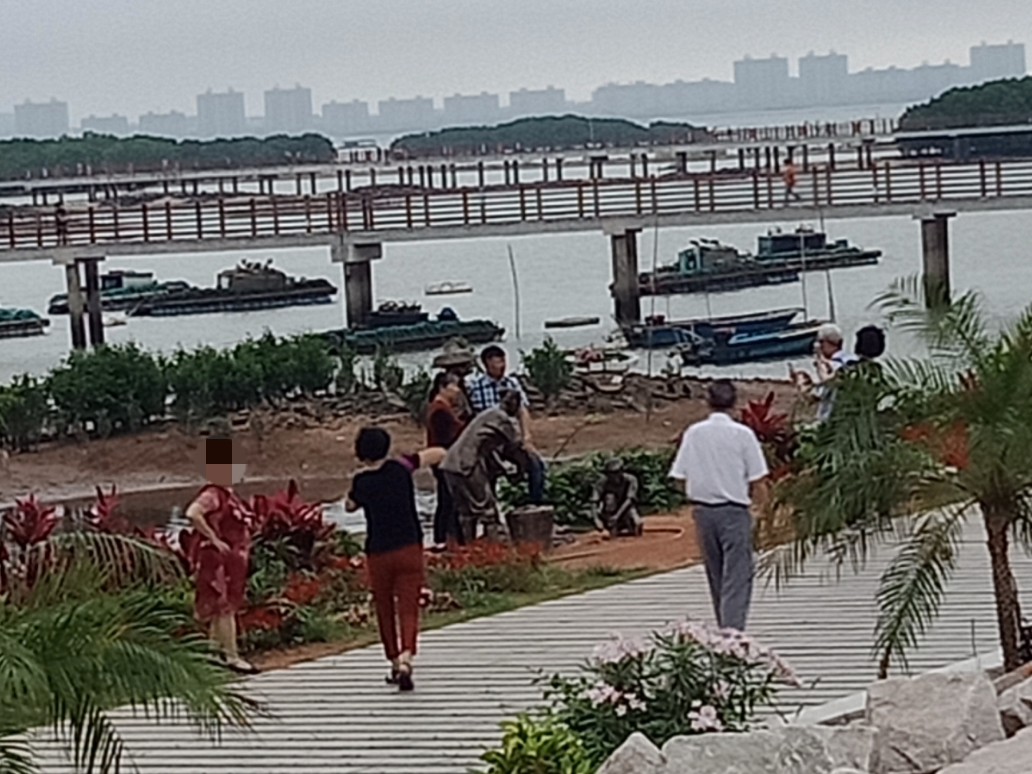 瓦发觉他她们对这些退潮后露出水面的小蟹跳跳鱼等、与还有海水浮在水面的竹胶排艇,挺有兴趣的?都拟见他她在栈道旁停足观摩~