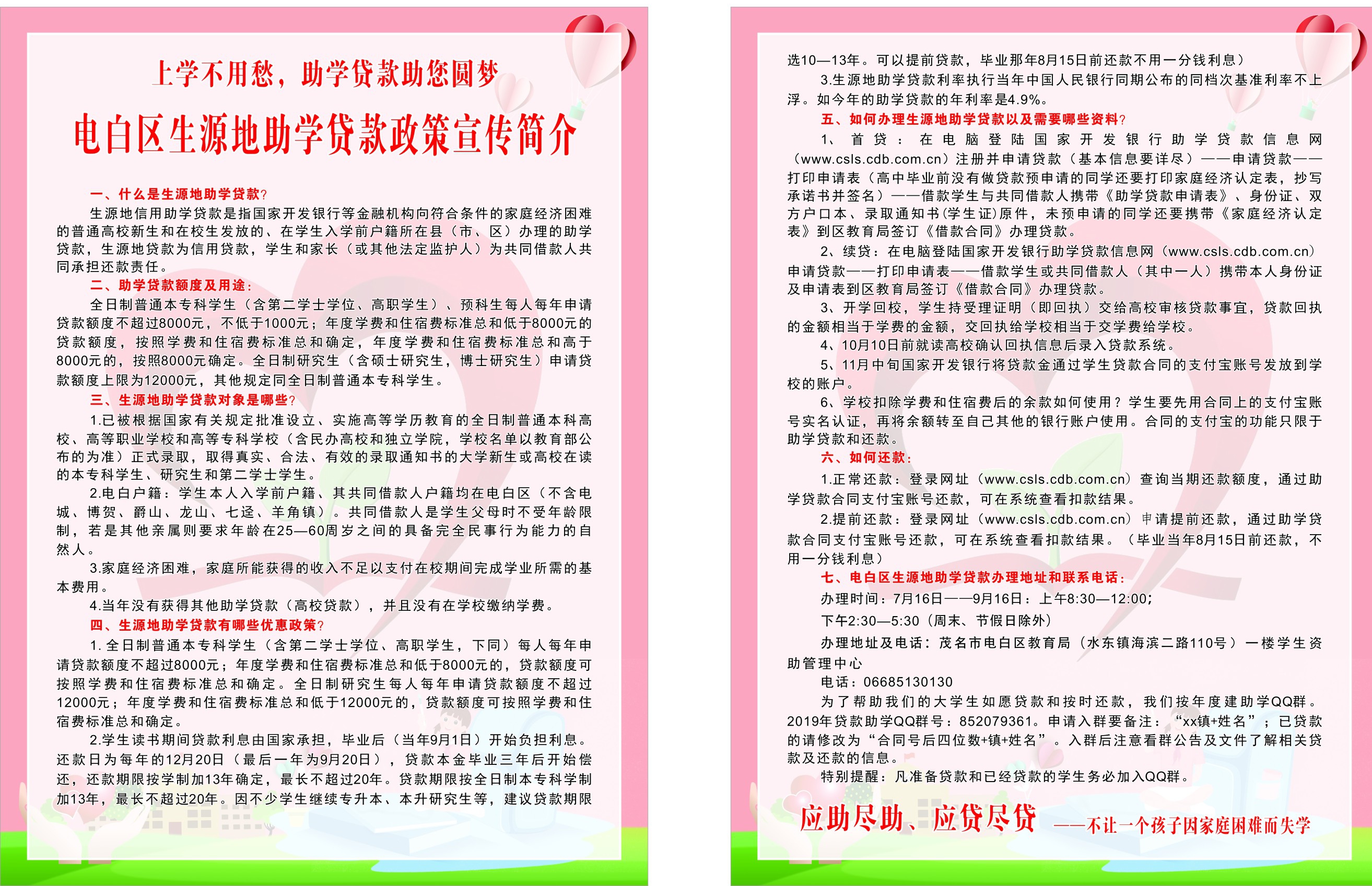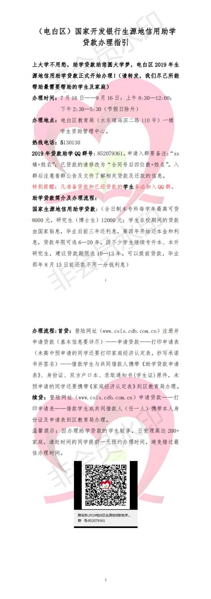 好消息!2019年电白区生源地信用助学贷款正式开始办理啦,办理时间为7月16日至9月16日,地点为电白区教育局一楼学生资助中心。下面是办理指引 。为了减少家庭的经济负担,为了帮助我们的孩子更加自强自立,学有所成,期望您的转发!(为了不扎堆来办理,请同学们提前一天登录QQ群:852079361预约办理时间)