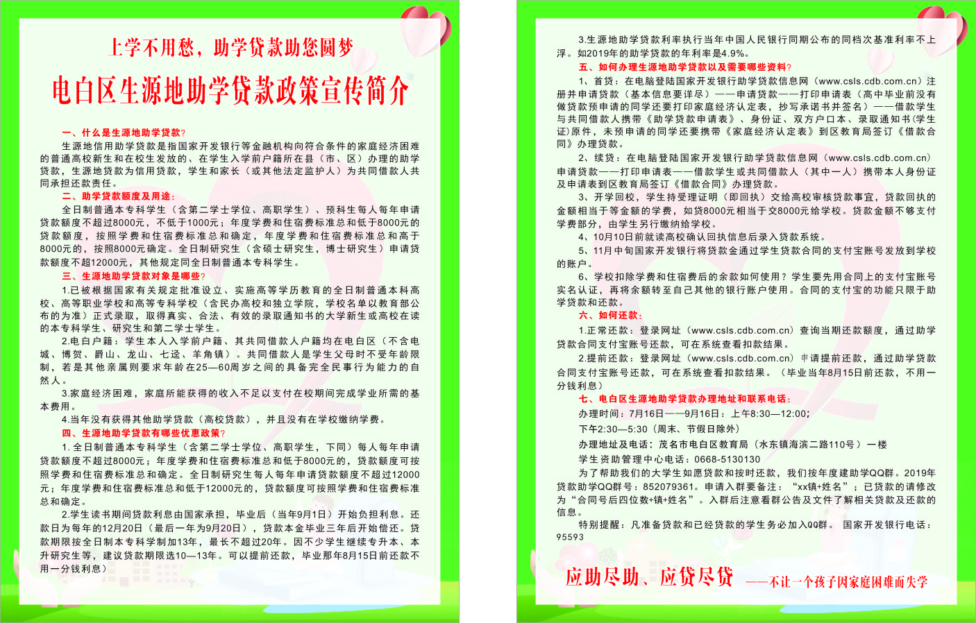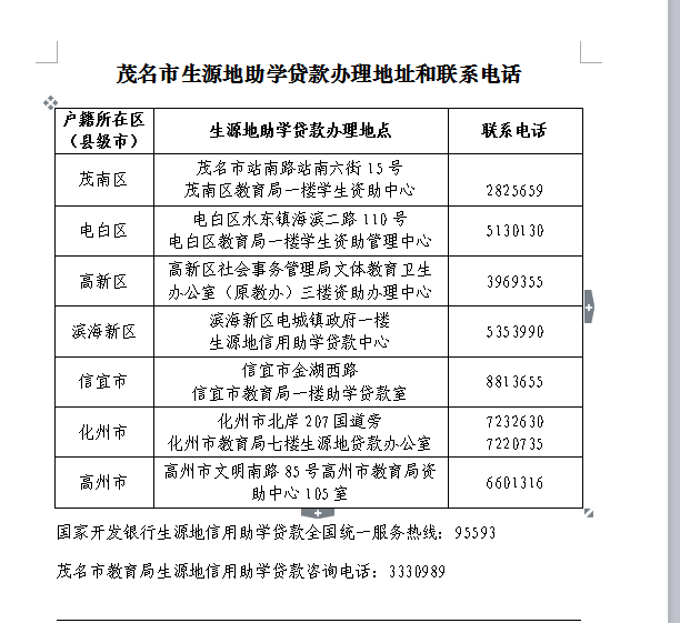 向 向阳天 幼儿园 注册 2017-08-16 消息 26 反馈评分 2 点数 0 2019-08-01 #1 好消息!2019年电白区生源地信用助学贷款正式开始办理啦,办理时间为7月16日至9月16日,地点为电白区教育局一楼学生资助中心。下面是办理指引 。为了减少家庭的经济负担,为了帮助我们的孩子更加自强自立,学有所成,期望您的转发!(为了不扎堆来办理,请同学们提前一天登录QQ群:852079361预约办理时间)