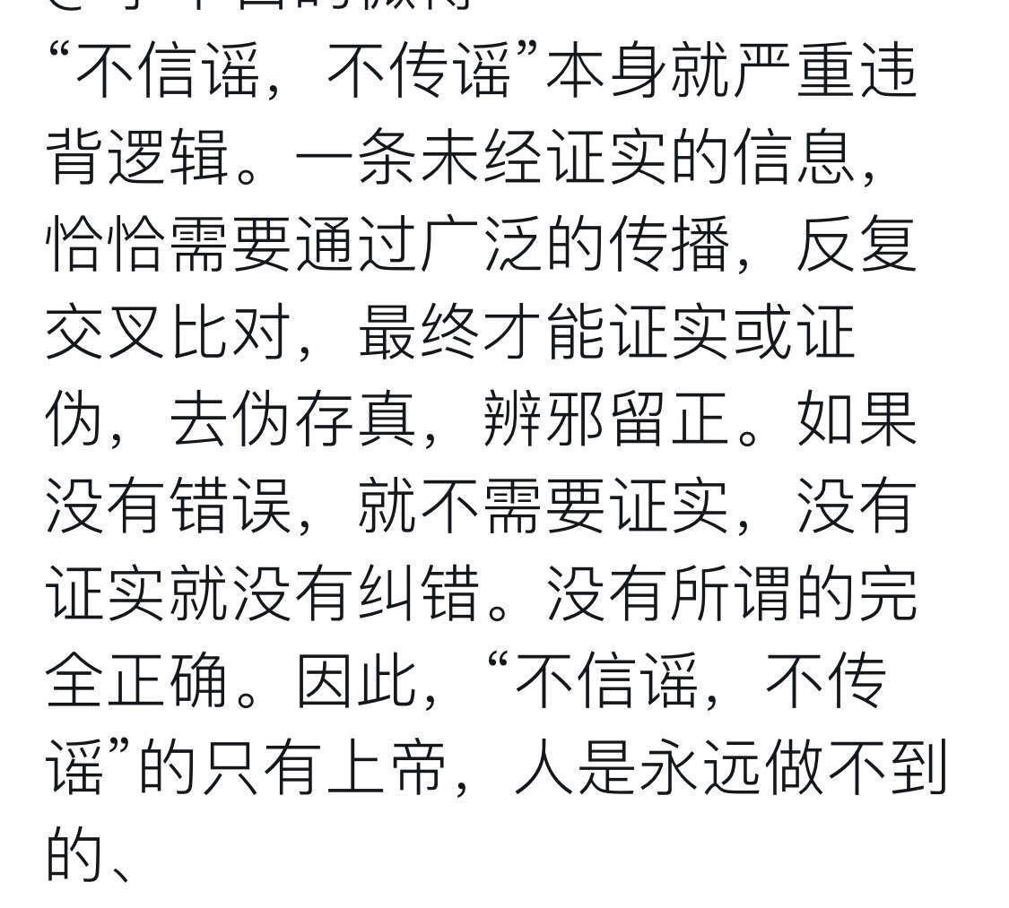 禁止传谣本来就是一个反科学的事,我哪知道是不是谣言,万一是真的,当事人也需要大家传出去吧?不然声音都没传出去就直接被否定了,实在恐怖。实在就是一言堂。