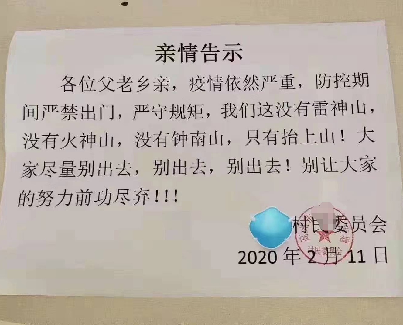 某村高度重视疫情防控的“亲情告示”!