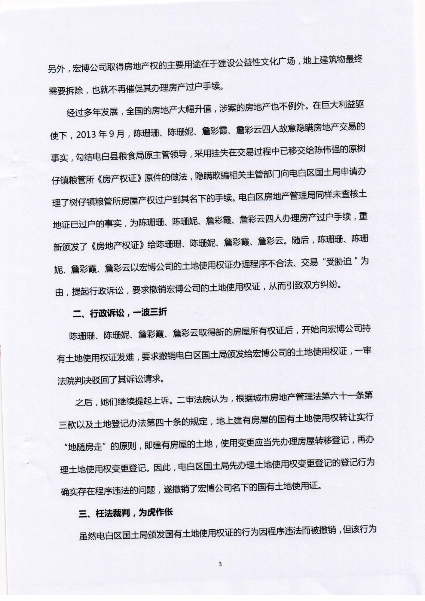 经过多年发展,全国的房地产大幅升值,涉案的房地产也不例外。在巨大利益驱使下,2013年9月,陈珊珊、陈珊妮、詹彩霞、詹彩云四人故意隐瞒房地产交易的事实,勾结电白县粮食局原主管领导,采用挂失在交易过程中已移交给陈伟强的原树仔镇粮管所《房产权证》原件的做法,隐瞒欺骗相关主管部门向电白区国土局申请办理了树仔镇粮管所房屋产权过户到其名下的手续。电白区房地产管理局同样未查核土地证已过户的事实,为陈珊珊、陈珊妮、詹彩霞、詹彩云四人办理房产过户手续,重新颁发了《房地产权证》给陈珊珊、陈珊妮、詹彩霞、詹彩云。随后,陈珊珊、陈珊妮、詹彩霞、詹彩云以宏博公司的土地使用权证办理程序不合法、交易“受胁迫"为由,提起行政诉讼,要求撤销宏博公司的土地使用权证,从而引致双方纠纷。