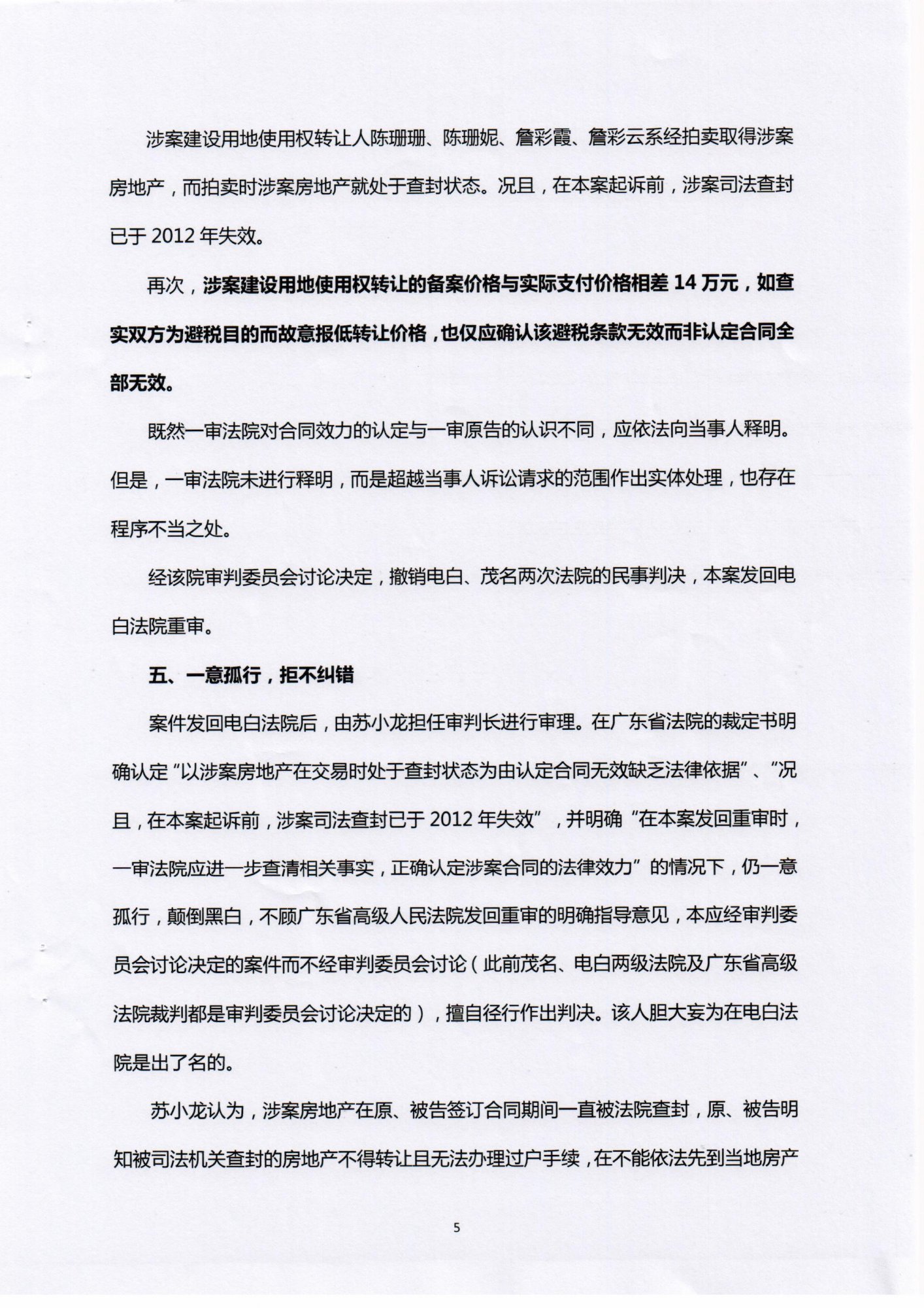 案件发回电白法院后,由苏小龙担任审判长进行审理。在广东省法院的裁定书明确认定“以涉案房地产在交易时处于查封状态为由认定合同无效缺乏法律依据”、“况且,在本案起诉前,涉案司法查封已于2012年失效”,并明确“在本案发回重审时,一审法院应进一步查清相关事实,正确认定涉案合同的法律效力”的情况下,仍一意孤行,颠倒黑白,不顾广东省高级人民法院发回重审的明确指导意见,本应经审判委员会讨论决定的案件而不经审判委员会讨论(此前茂名、电白两级法院及广东省高级法院裁判都是审判委员会讨论决定的),擅自径行作出判决。该人胆大妄为在电白法院是出了名的。