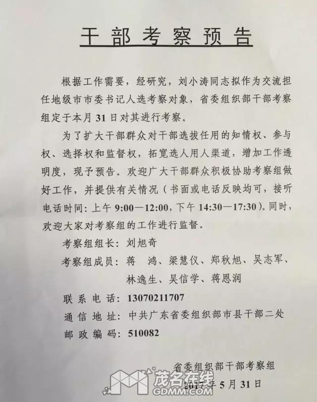 经省委常委会议讨论,茂名市委常委、电白区委书记刘小涛同志拟提名为汕头市市长候选人,惠州市委常委、常务副市长王胜同志拟提名为云浮市市长候选人。根据《党政领导干部选拔任用工作条例》规定,现予公示,征求党员、群众和单位的意见。