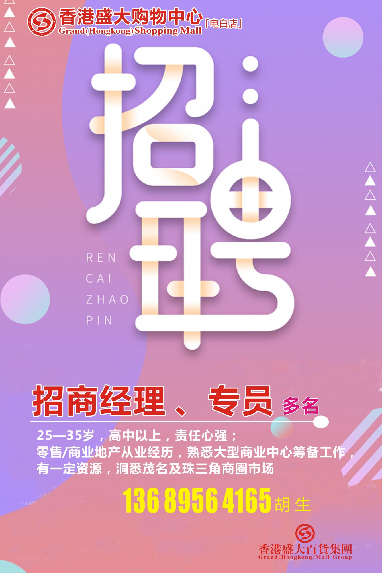 香港盛大百货集团强势进驻电白商业中心,目前进入紧张有序筹备阶段,现诚聘人才: 招商经理、招商专员多名, 男女不限,25-35岁,高中文化以上,责任心强,零售/商业地产从业经历,有一定商户资源,熟悉茂名、珠三角地区商圈市场。