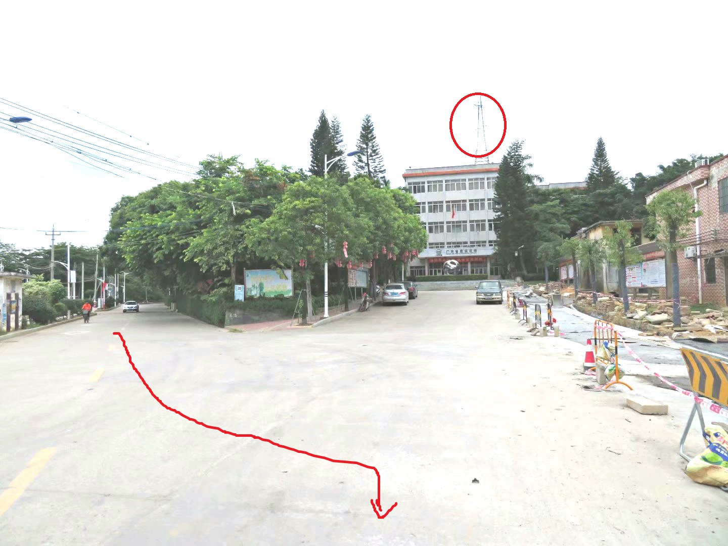 有红圈处是建设农场场部, 红线的尾部是去建设农场学校。1968年6月29日清晨,从化州县新安广东红阳农场打仗胜利归来的吴川县批资站派武斗队沿着建设农场学校这条红线箭头的道路途经建设农场场部,不知道部分东风派武斗队已占据建设农场场附近一带了,批资站派武斗差不多出到现在291国道锡海线时被发现,由于对方人多、枪多,批资站派一边与东风派对抗,一边逃离,但最后还是有5个批资站派青年被被俘,当天他们被东风派押到291国道旁边的岭仔斩头,凶手手段极端残忍。