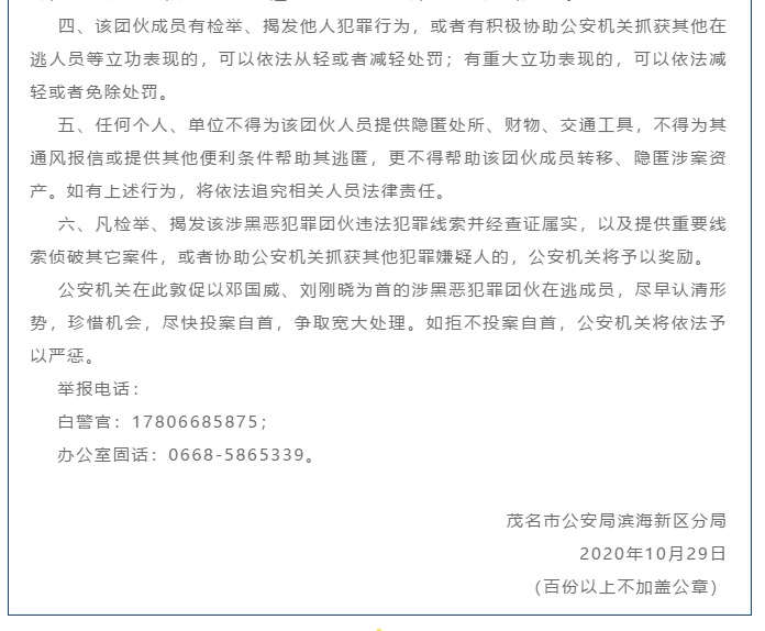 按照党中央关于扫黑除恶专项斗争的部署,为维护平安和谐的社会治安环境,保障人民群众安居乐业,2020年8月,茂名、滨海新区两级公安机关重拳出击成功侦破一个以邓国威(绰号:“木良”)、刘刚晓(绰号:“胖老虎”)为首的涉黑恶犯罪团伙案件。该团伙长期盘踞在电白区观珠镇、沙琅镇等地进行开设赌场、绑架、故意伤害、寻衅滋事、敲诈勒索等违法犯罪行为,攫取暴利,严重扰乱社会治安和生产生活秩序。初步査实该团伙涉嫌大量违法犯罪事实。现就有关事项通告如下: