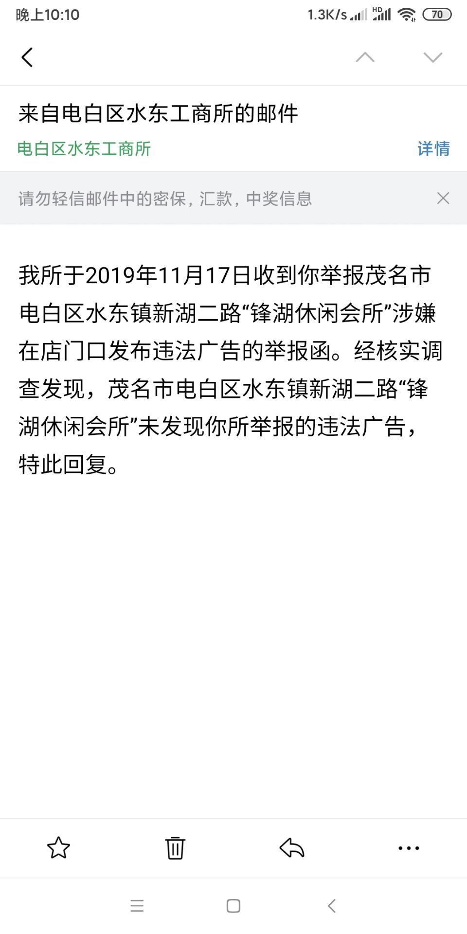 茂名市电白区市场监督管理系统回复的“未发现”,举报时有照片并且及时举报;广大人民群众请擦亮眼睛。广东省公安厅、茂名市公安局、电白区公安局、各派出所及各行政单位、企事业单位,请高度认真关注。茂名市纪委监委、电白区纪委监委请尽快查到相关涉嫌腐败的工商人员。期待中央纪委监委、广东省纪委监委抓到人。