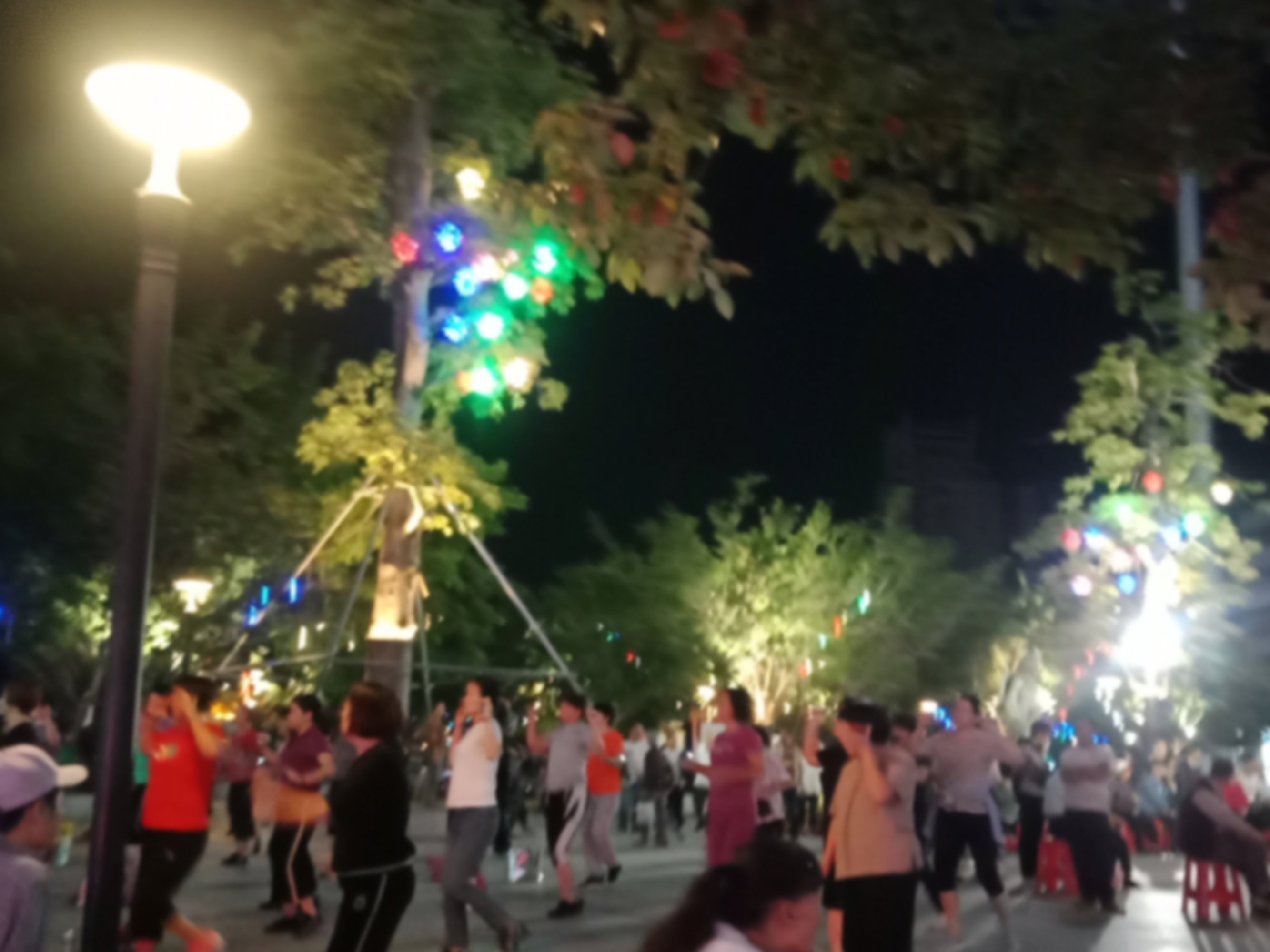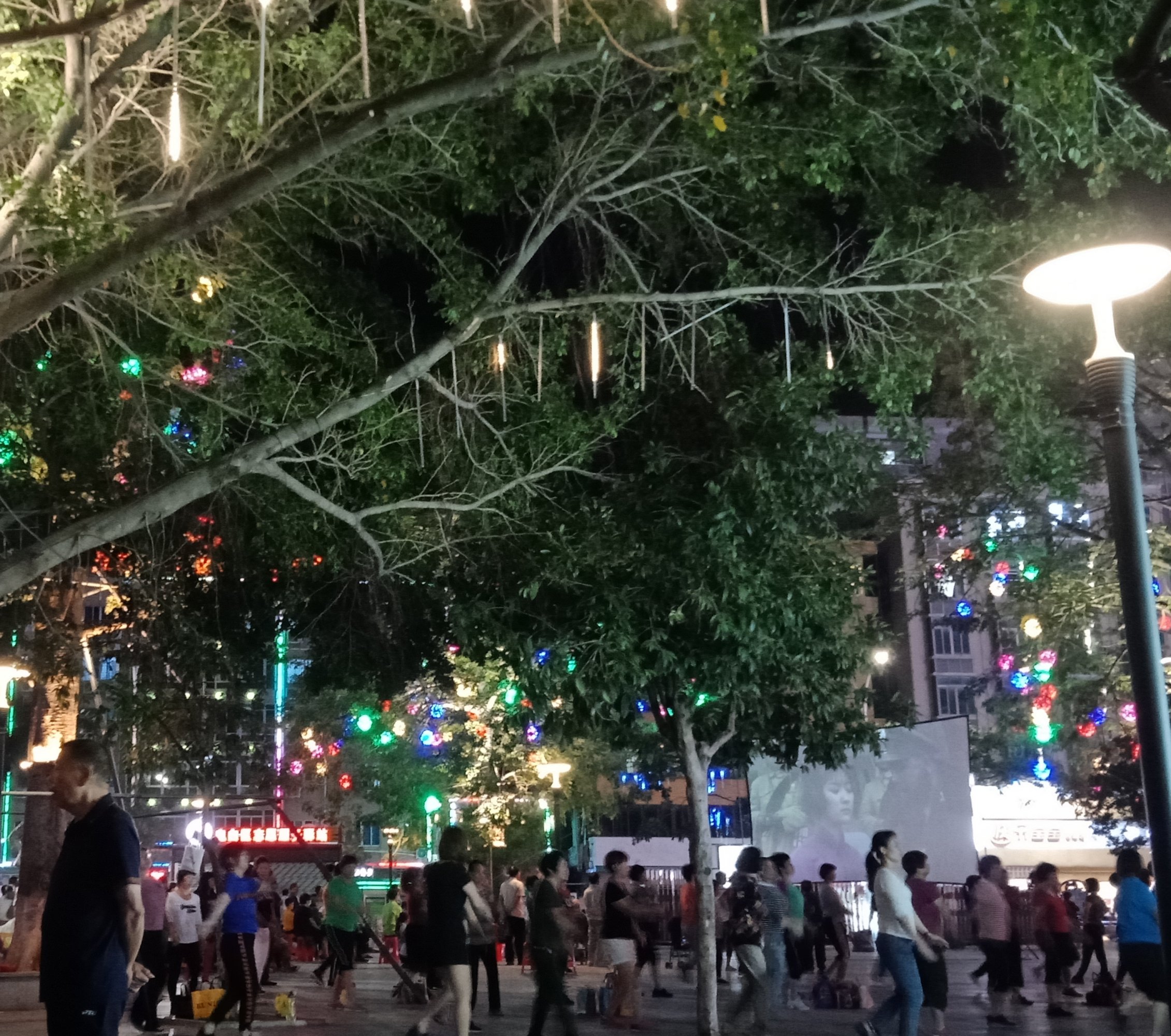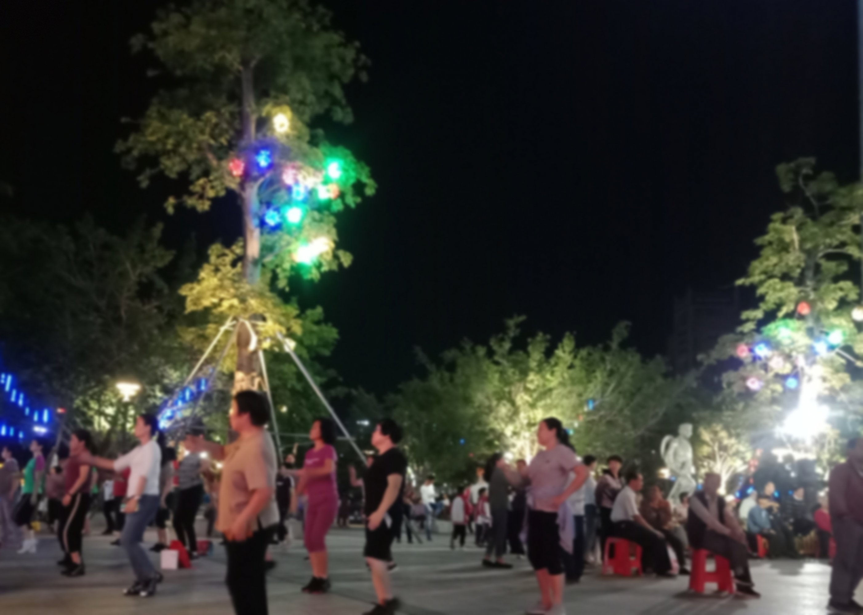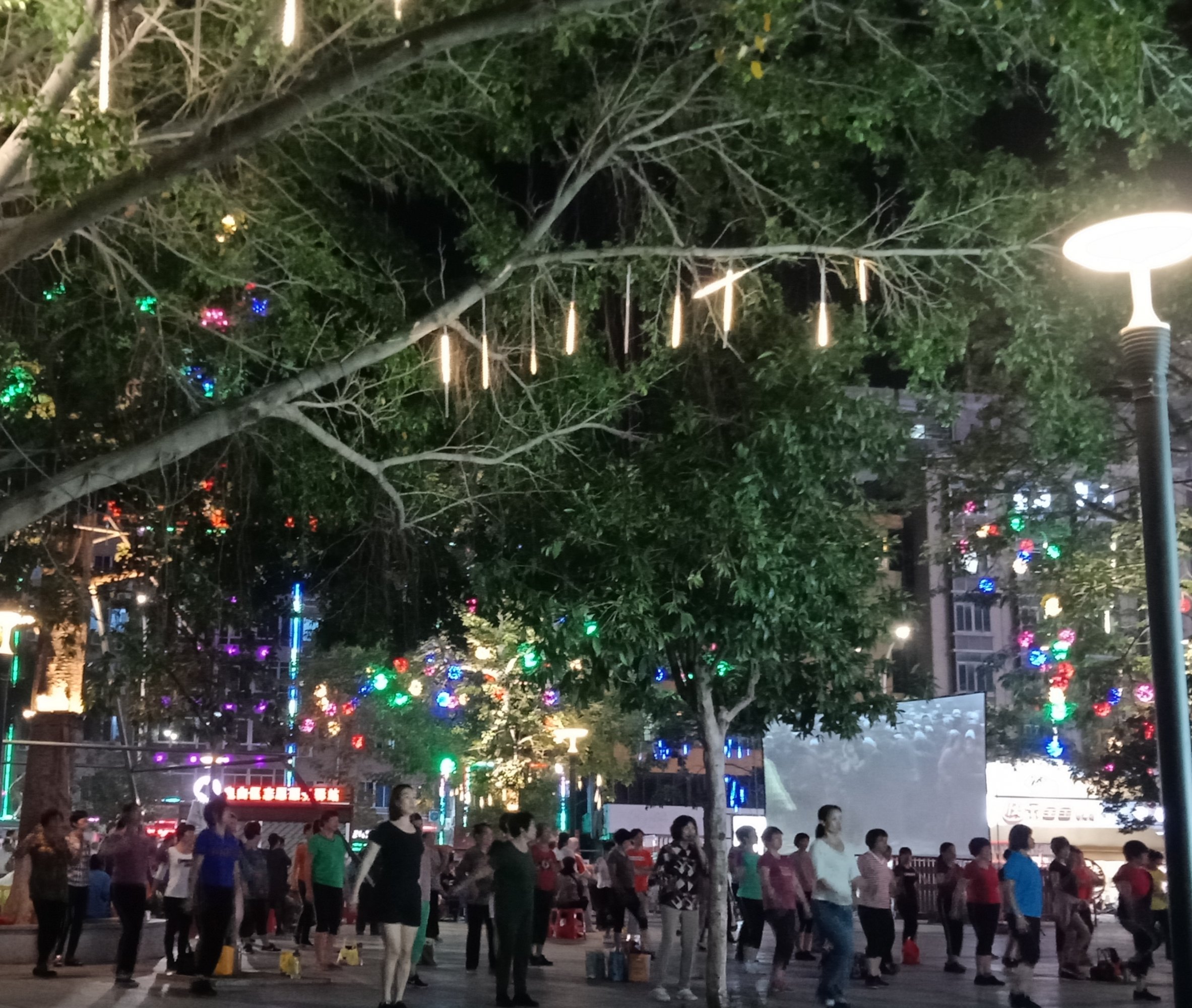 坐在石凳上,一直观摩,但我没靠走近她们,所以也没听见她们所说的,但从她们的动作指指点点,纯属我猜测,可能有些人说,今晚场地给投影了,就改天再来?可能又有些人说竟然过来了,就随便找个地方舞动下?…?又可能有人说不知这投影要放多久?后只见有人指向投影旁的较小范围位置、、、?于是乎,只见大部队、、、