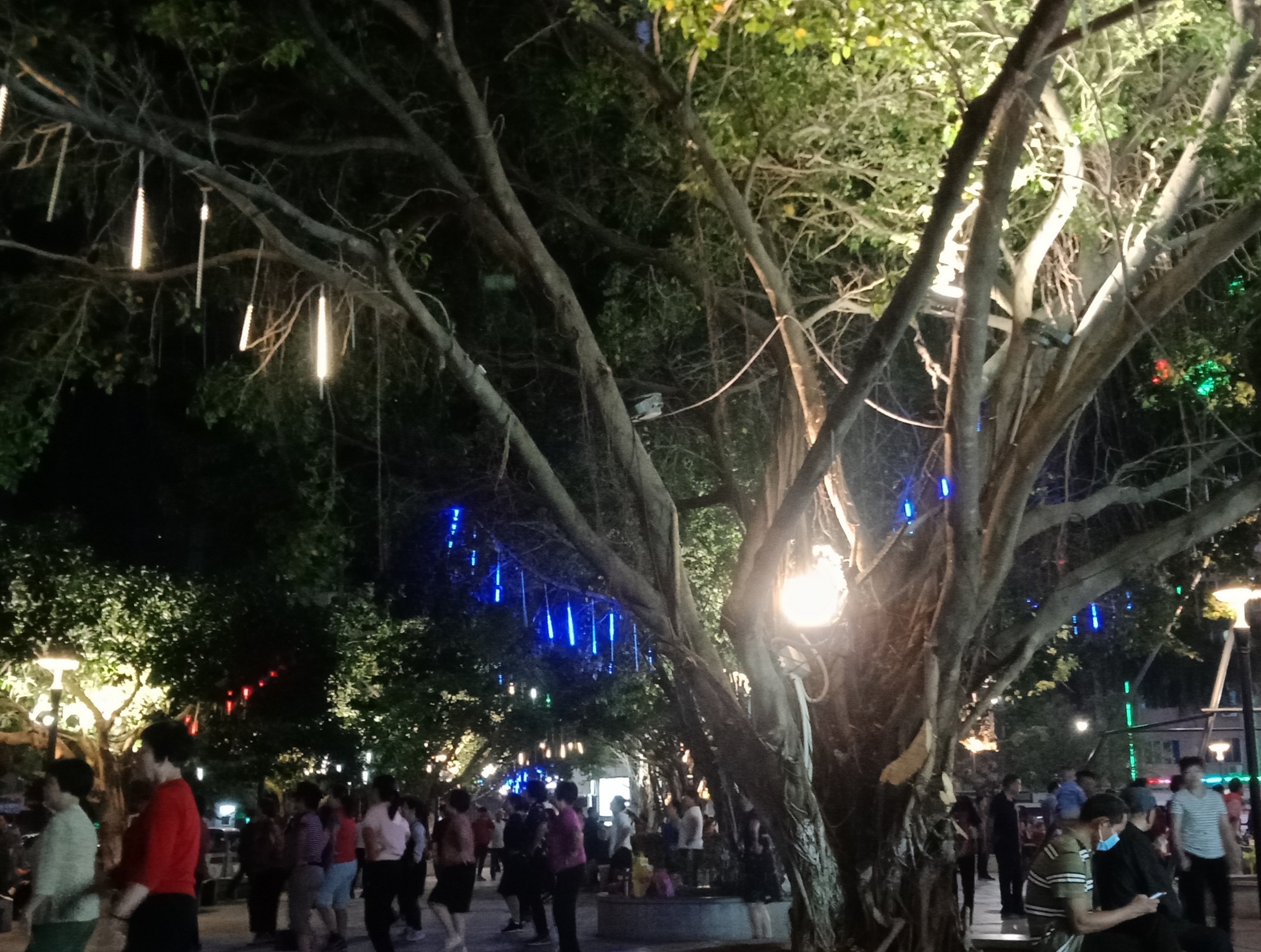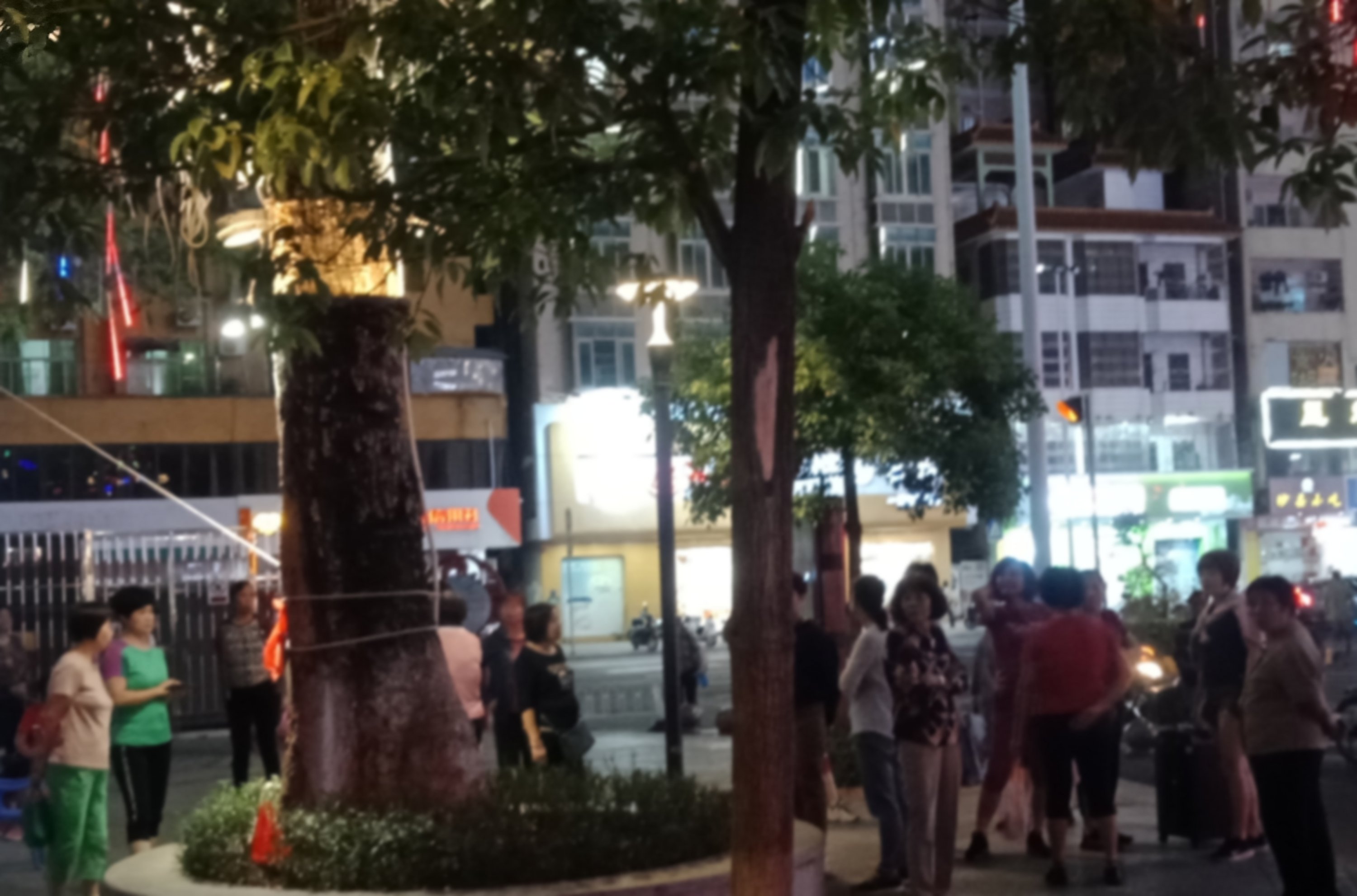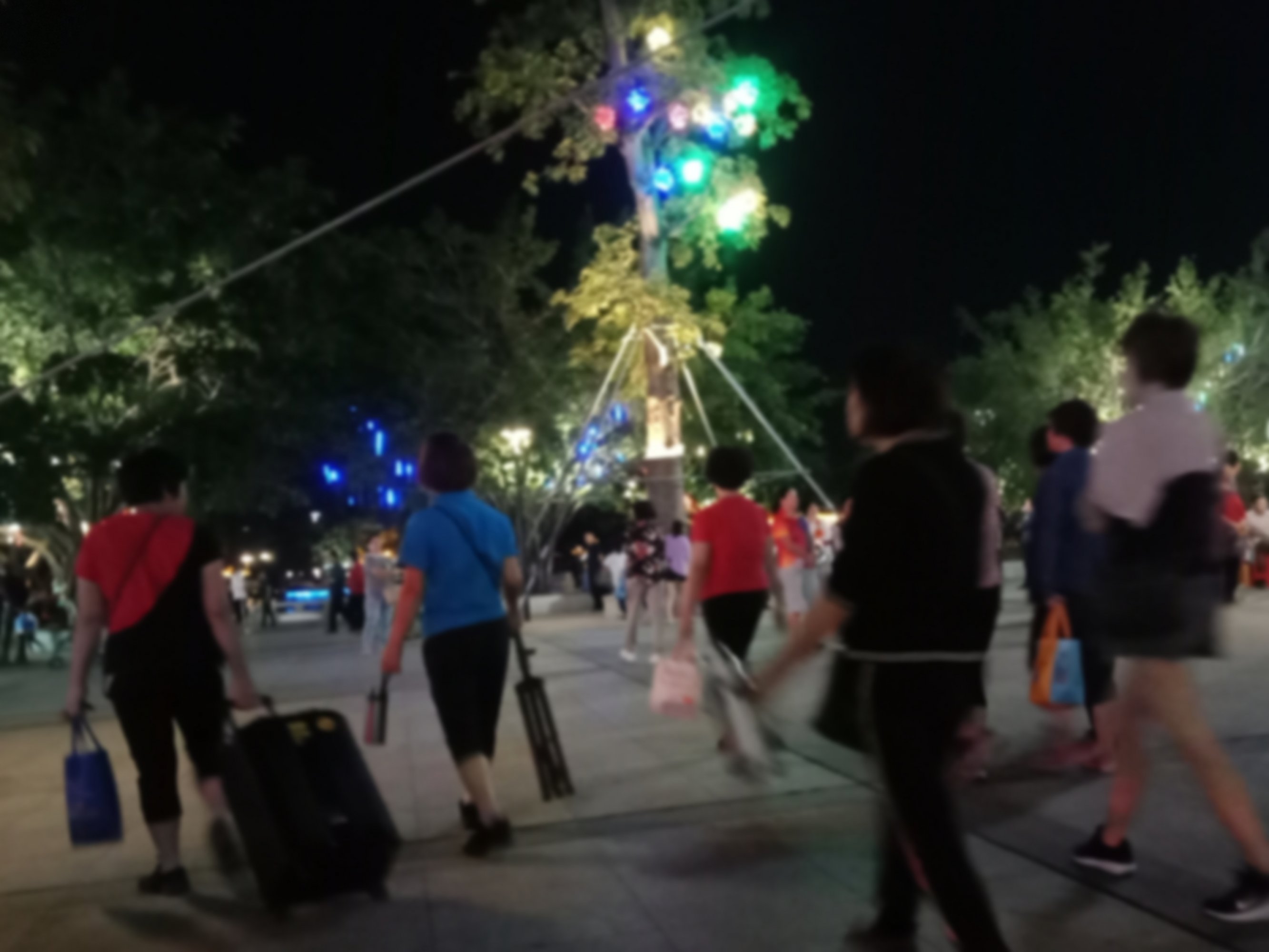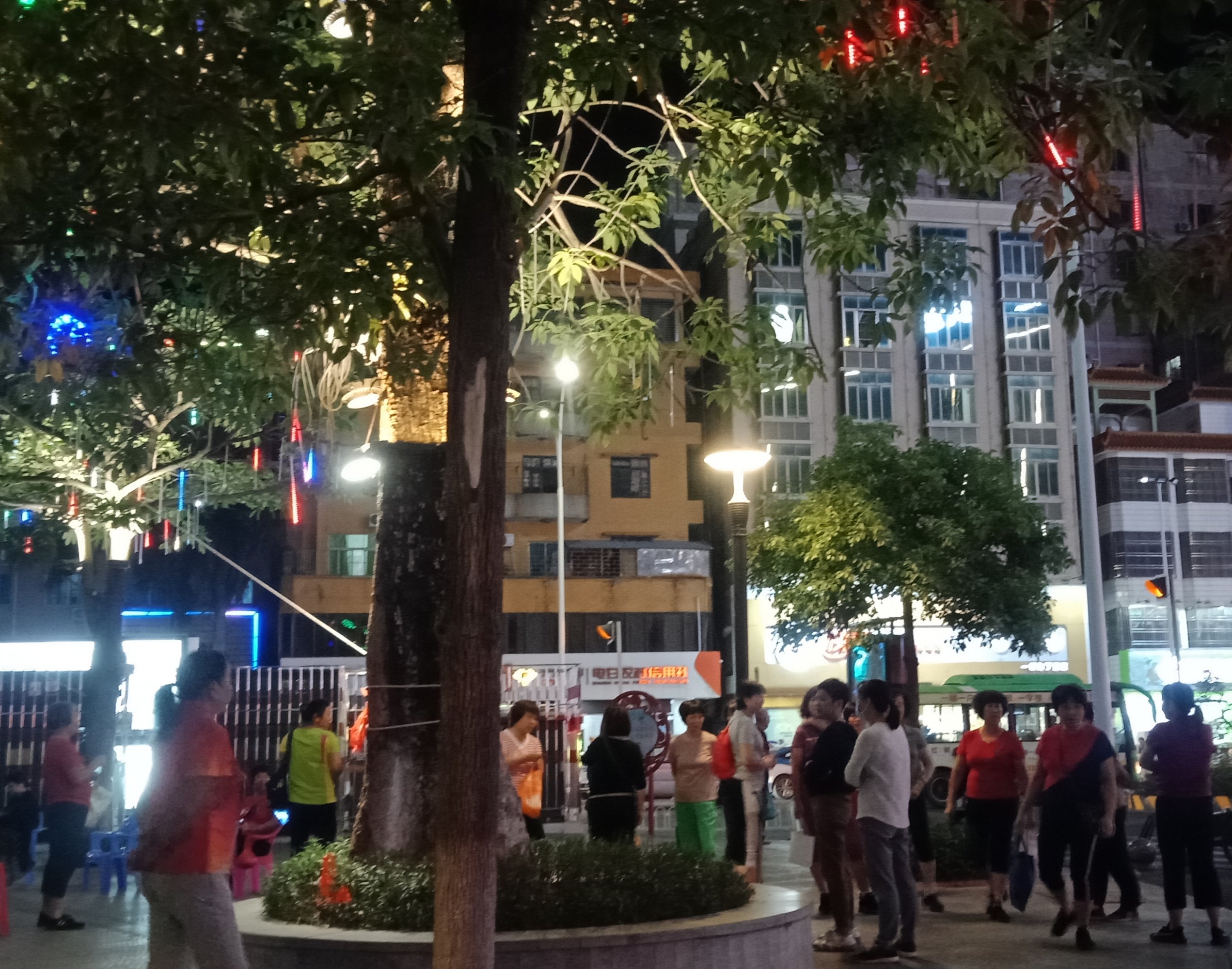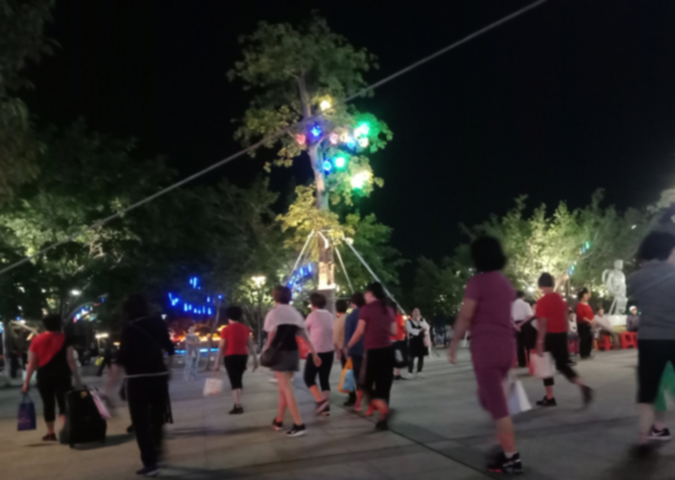 坐在石凳上,一直观摩,但我没靠走近她们,所以也没听见她们所说的,但从她们的动作指指点点,纯属我猜测,可能有些人说,今晚场地给投影了,就改天再来?可能又有些人说竟然过来了,就随便找个地方舞动下?…?又可能有人说不知这投影要放多久?后只见有人指向投影旁的较小范围位置、、、?于是乎,只见大部队、、、