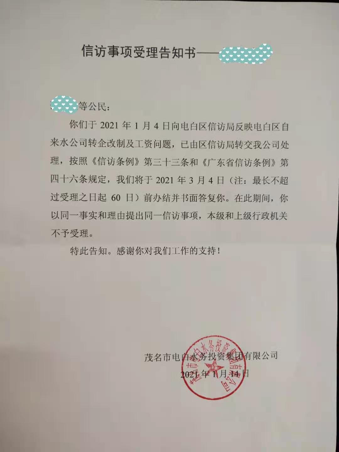 茂名市电白区水务投资集团回复区自来公司职工信访件来了!!!