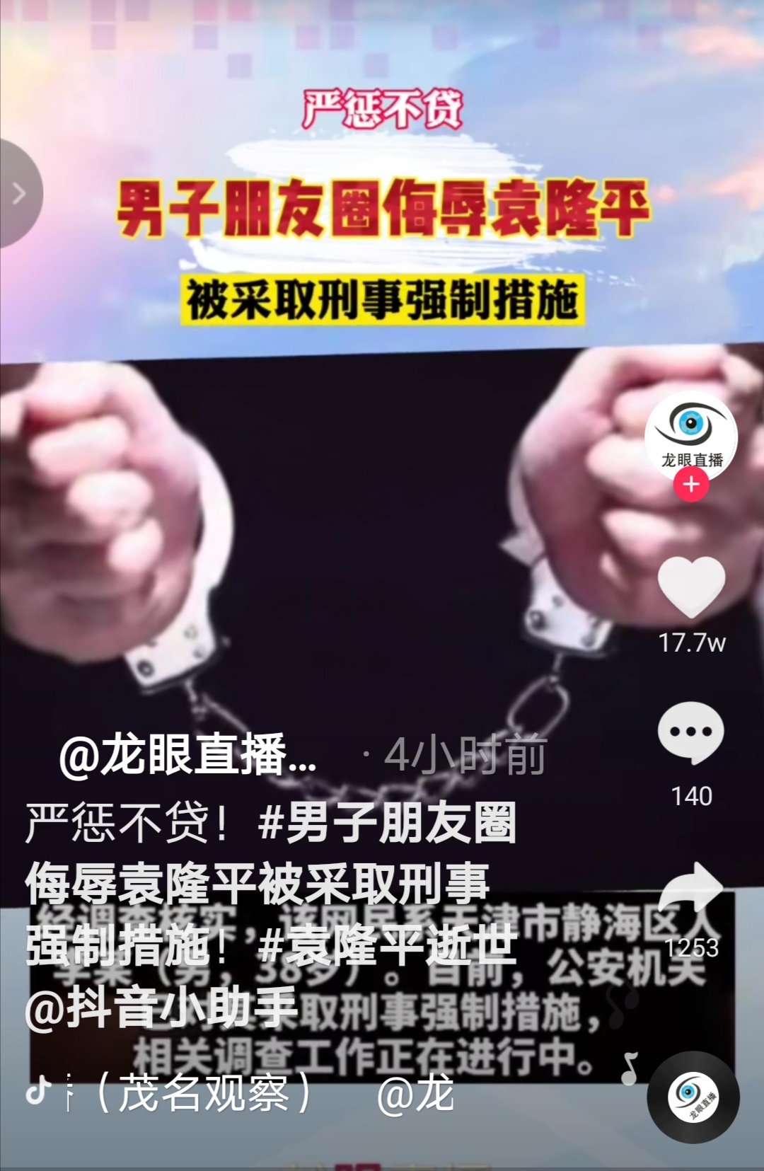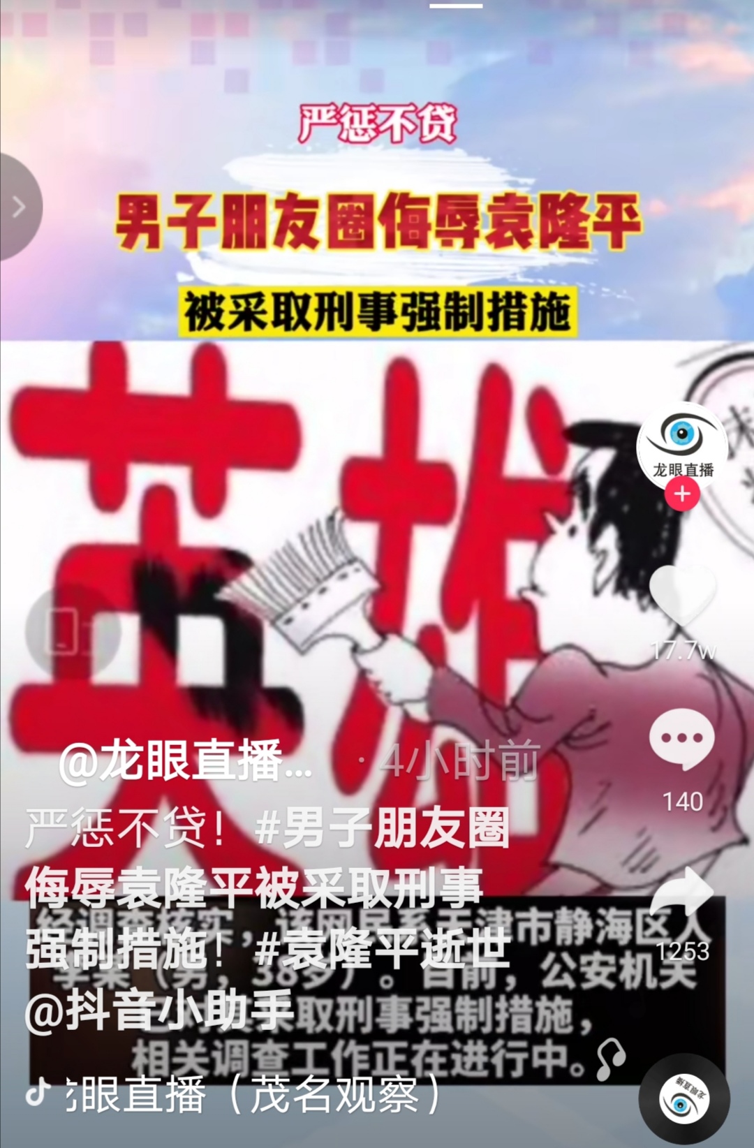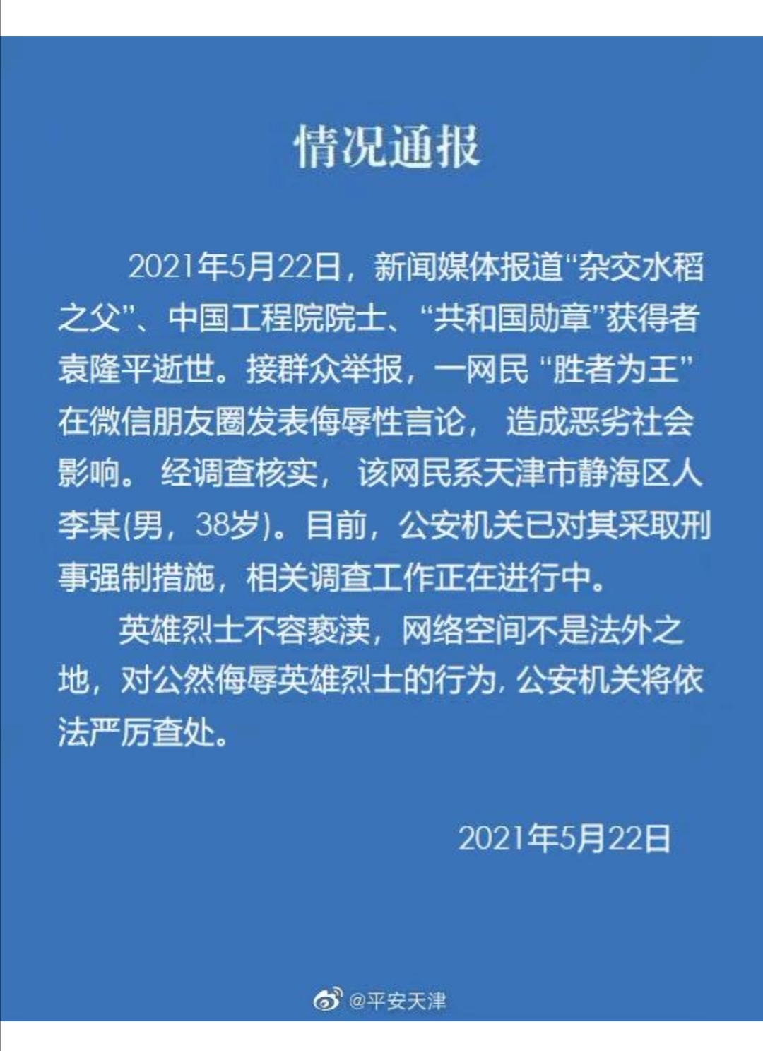 绿城风景 副教授 注册 2018-05-28 消息 2,017 反馈评分 179 点数 101 2021-05-23 #15 小石龟 说: 脑残,真多 。我就,喜欢颜宁。像电白论坛16年什么院士,还不是小人一个。 点击展开... 天津市静海区网民,李某,38岁,侮辱袁隆平院士被打执行强制措施。