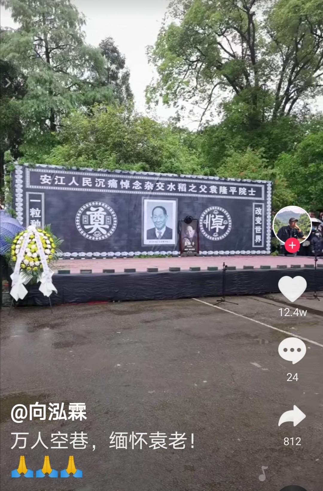 汪洋大海 荣誉会员 荣誉会员 注册 2011-03-01 消息 12,156 反馈评分 348 点数 191 年龄 67 性别 男 2021-05-22 #1 七绝·沉痛哀悼“杂交水稻之父”袁隆平院士 文/汪洋大海 今日全球万众哀, 送辞袁老泪纷来。 稻畴从此无蛙鼓, 因为三更没叟催。