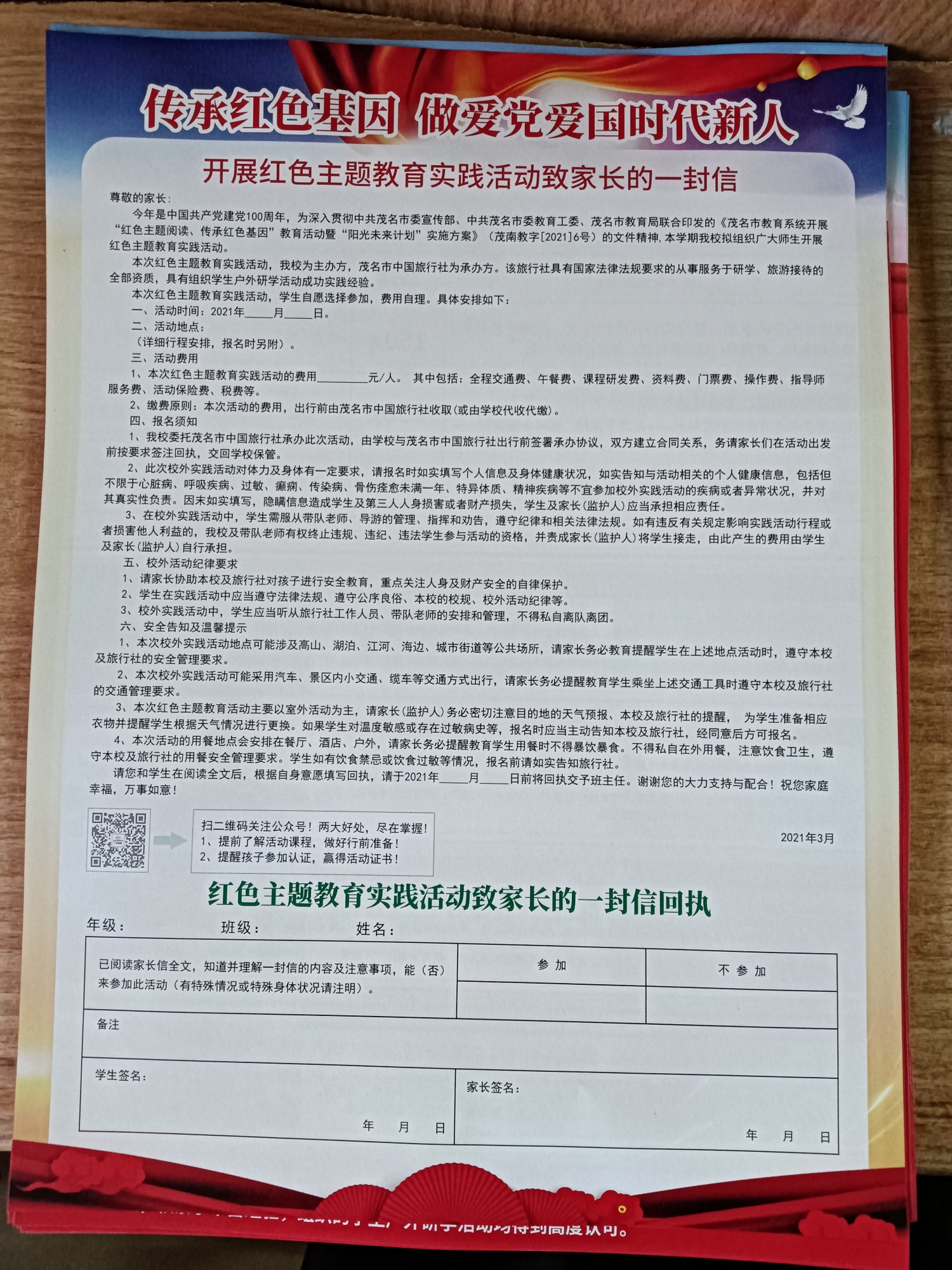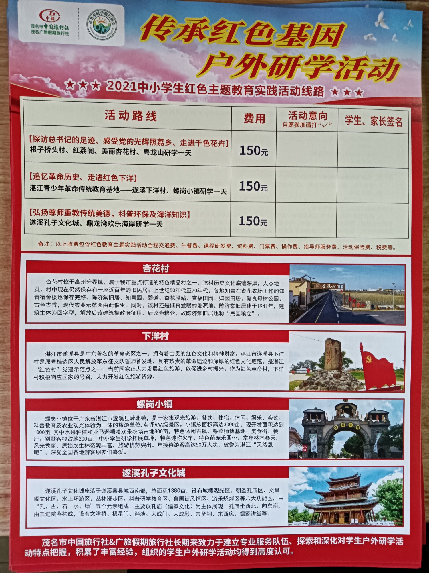 人间不清醒 说: 关于“红色主题教育实践活动”的通知 时间:初步定在11月17日; 地点:第一条路线(根子桥头村——红荔阁——杏花村——粤龙山研学一天); 收费:150元每人 本次活动是班级第一次集体课外实践活动,希望能全体同学参加,这样活动才更有意义,没特殊情况的话尽量参加。报名参加的同学请接龙并填好以下信息表,费用可私发给我。 啰嗦两句:去年刚去过,现在又去是不是太频繁?现疫情形势下是否合适?景点没有包场的吧? 教育局和旅行社是为了拉动内需吗?浏览附件352551 浏览附件352552 点击展开... 没出事还好,像上次茂名一大巴着火,要不是路人及时叫停车就惨了,一大车学生