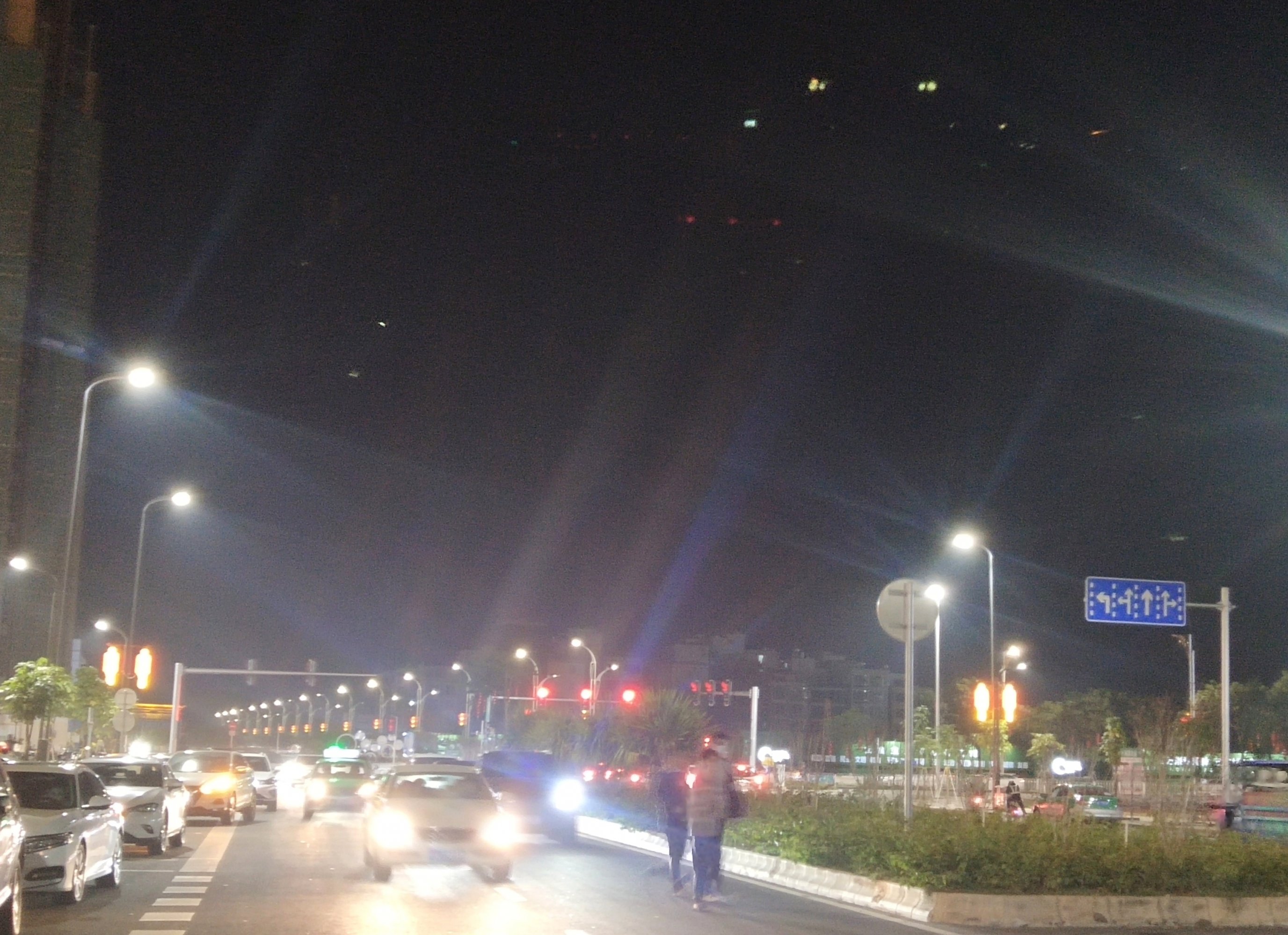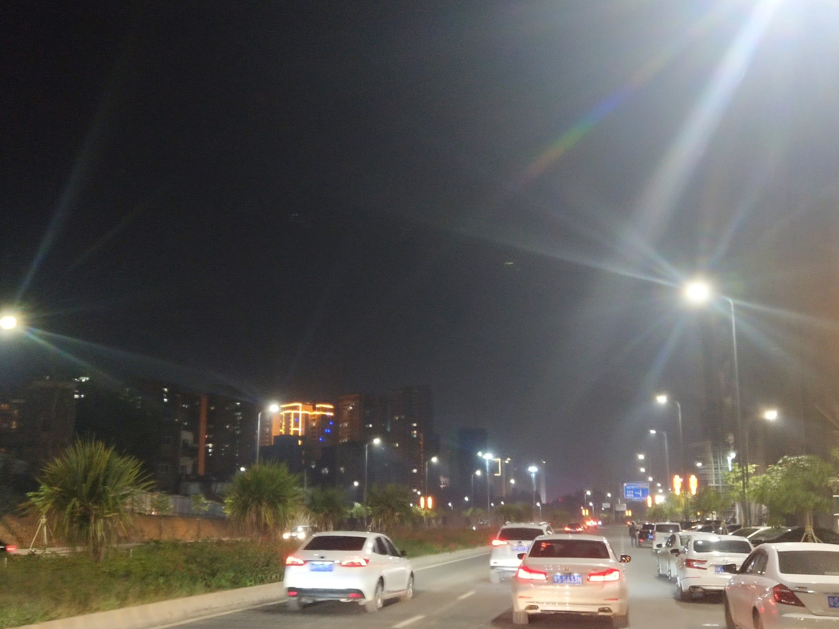 像灯柱上的喜庆灯也亮起来,10点几了还车来车往、、