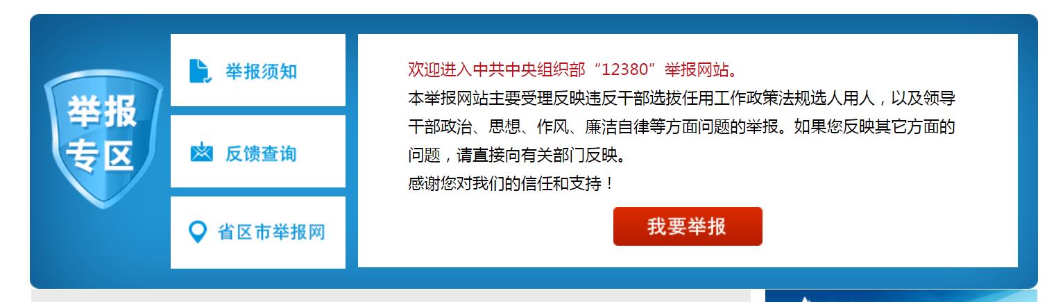 举报须知 1、本举报网站主要受理反映违反干部选拔任用工作政策法规选人用人,以及领导干部政治、思想、作风、廉洁自律等方面问题的举报。如果您反映其他方面的问题,请直接向有关部门反映。 2、请认真填写举报表单中的各项目。填写“主要问题”一项时,要写清楚问题发生的时间、地点、情节、后果等,字数限定在800字以内。 3、举报人应实事求是地反映问题。对利用举报捏造事实,进行诬告陷害的,依照有关规定严肃处理;构成犯罪的,移交司法机关处理。 4、提倡实名举报。进行实名举报的,请详细填写联系电话等项目。 5、中央组织部“12380”网上举报受理工作介绍。 6、联系电话:(010)12380。 7、为保障举报人的合法权益,限制恶意重复举报和垃圾信件,提高网上举报的运行效率,举报人计算机每天最多只能提交5件举报。 (为保证举报信息传输的安全,系统会自动弹出“安全警报”或“安全证书”对话框,请点击“是”或“继续浏览”,进行举报。)