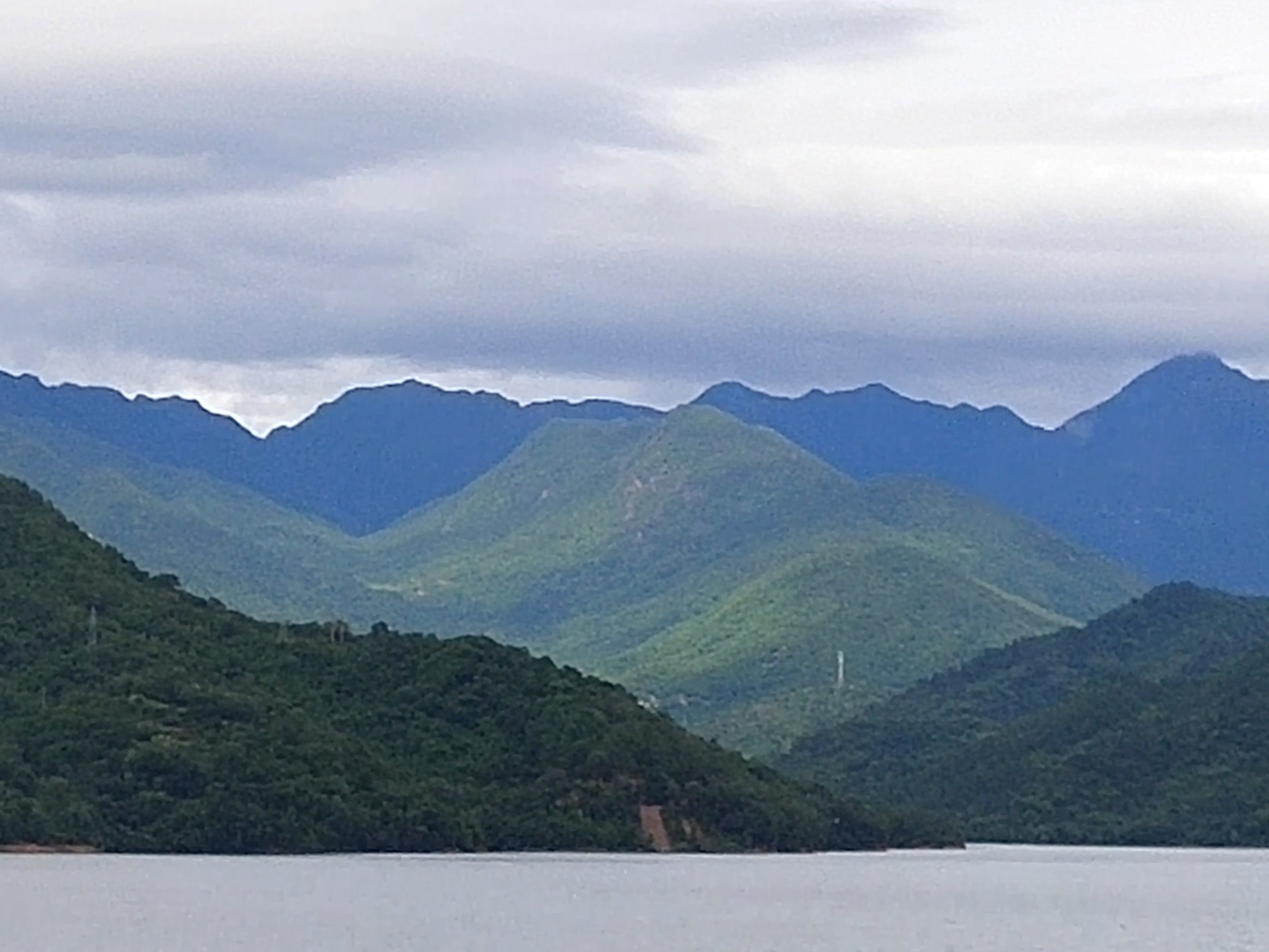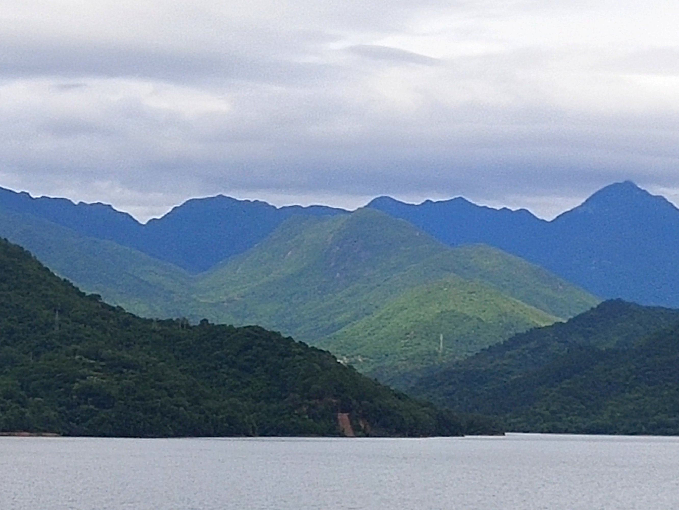 中间山太阳照射,前后云层遮挡阳光,视觉上前灰后蓝!正常,不是大神修练
