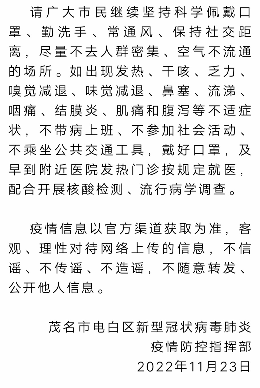 及早预警,及早预示,及早摸排,及早发现,及早处置...,盼望大家能配合与谅解!排除降低社会面,期望能早日清零,最好零增长?或增长与风险降至最低,优化二十条,尽可能用心用情减少对民生、经济等等领域的波动...电白是福地!说得虽然有点打鸡血,好像有些年了,但还是说声电白加油! 您的浏览器无法播放此音频。