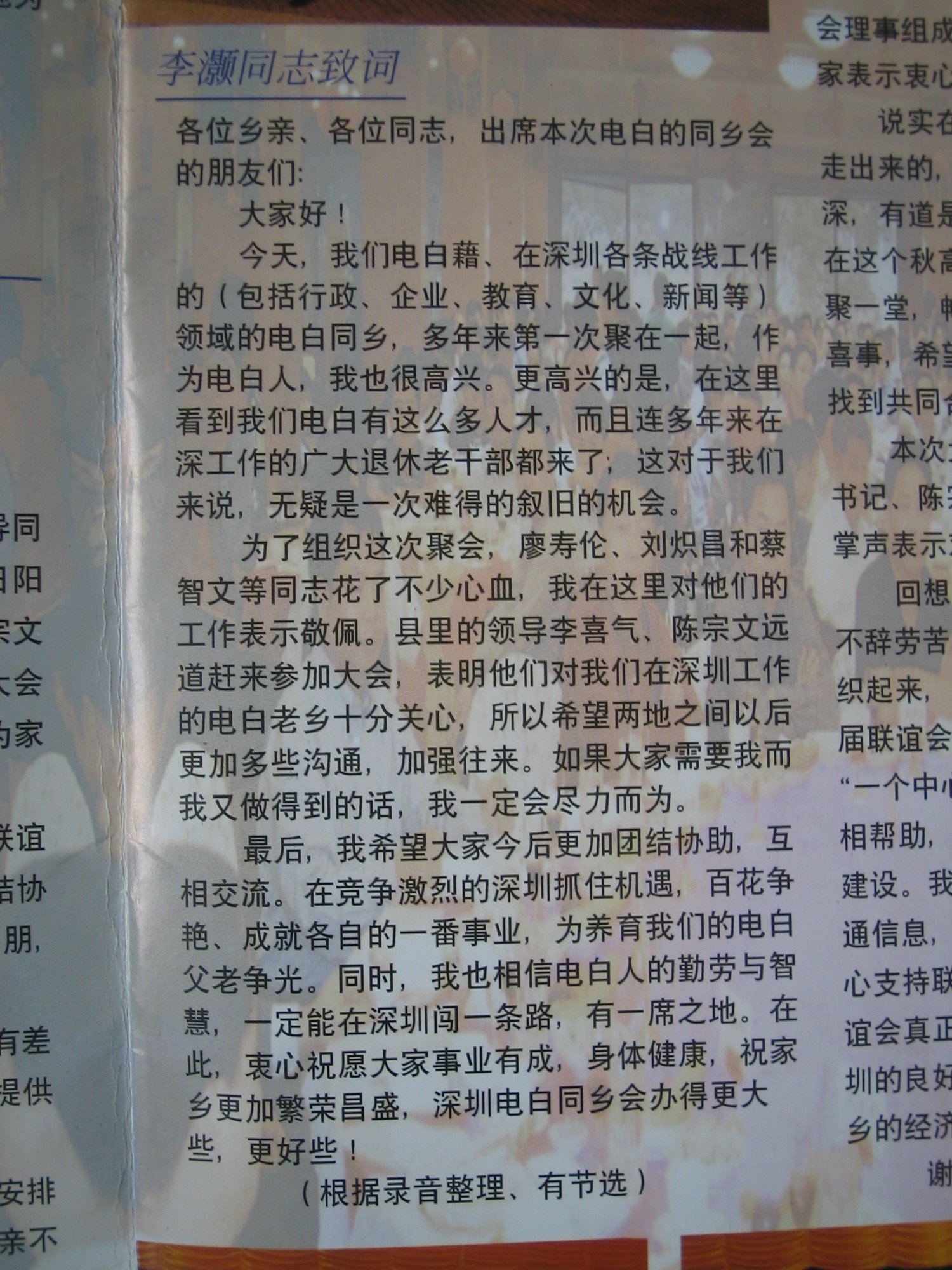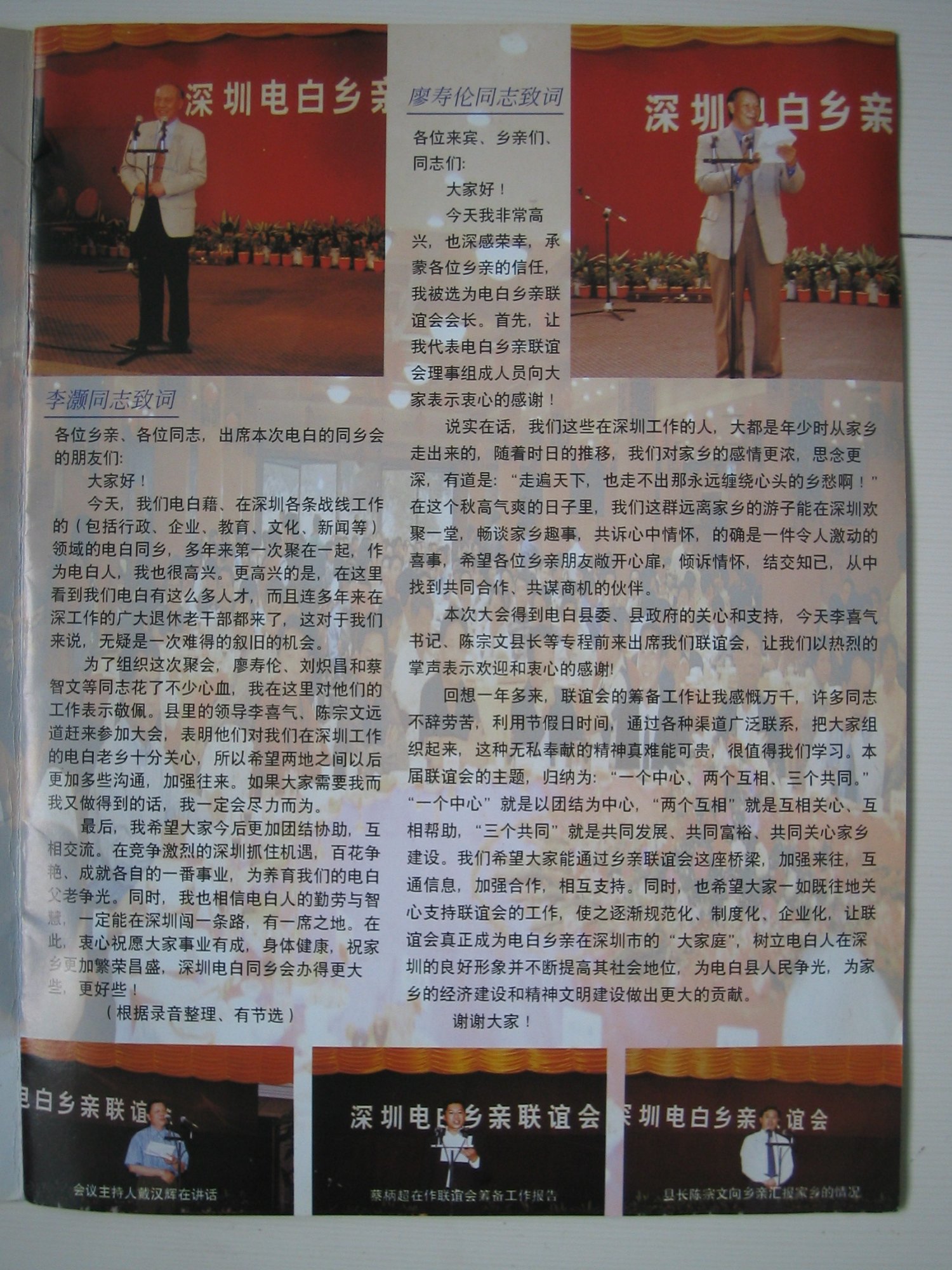 该刊物是记录在2001年11月10日在深圳银湖旅游度假中心会议大厅召开的《深圳电白乡亲联谊会》成立大会的会议盛况!