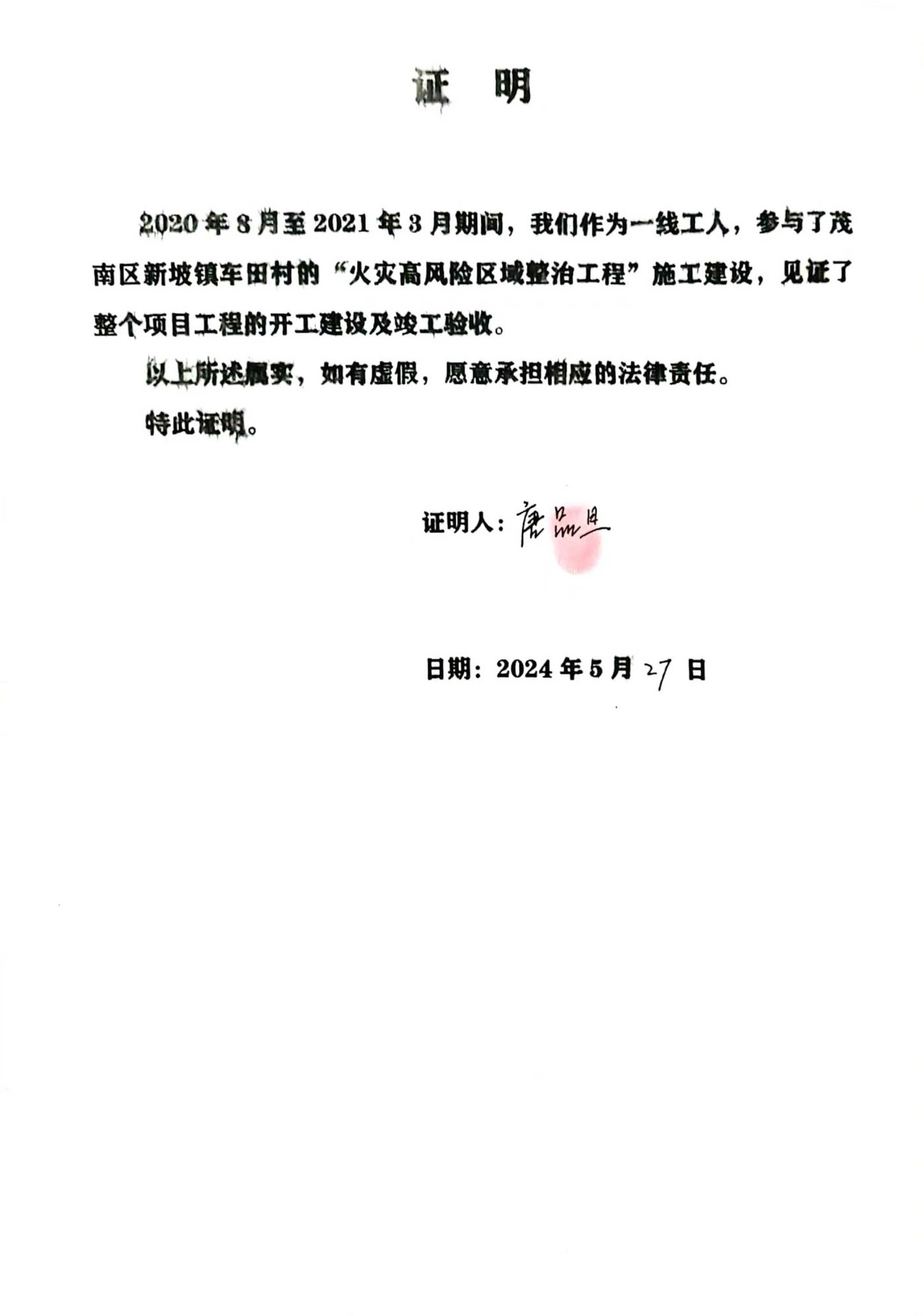对于此次火灾高风险区域整治工程,车田村委会出具的书面证明,证实了该工程由茂名市众扬设计制作有限公司陈先生等人施工建设。工程竣工不久后,杨敏镇委书记完全否认此事,他说按合同办事,言下之意当时双方没签合同,且事后也不补签,巳至于郑勇患病因无钱医治而去逝。30万元的工程款就等于打水漂了,十位工人耗时8个月的汗水就是白流了,岂不是挖一个巨大的火坑让群众往里面跳吗?