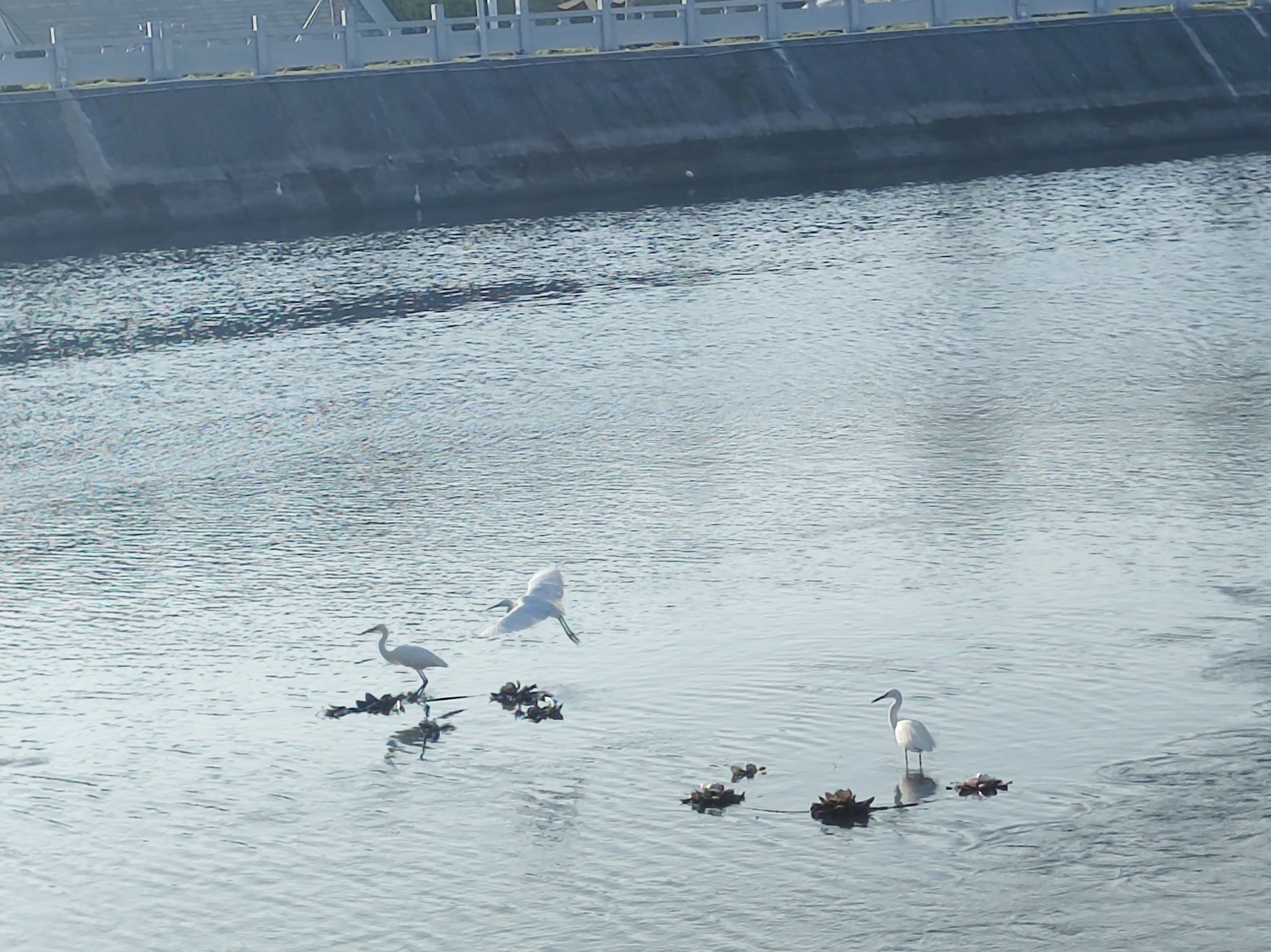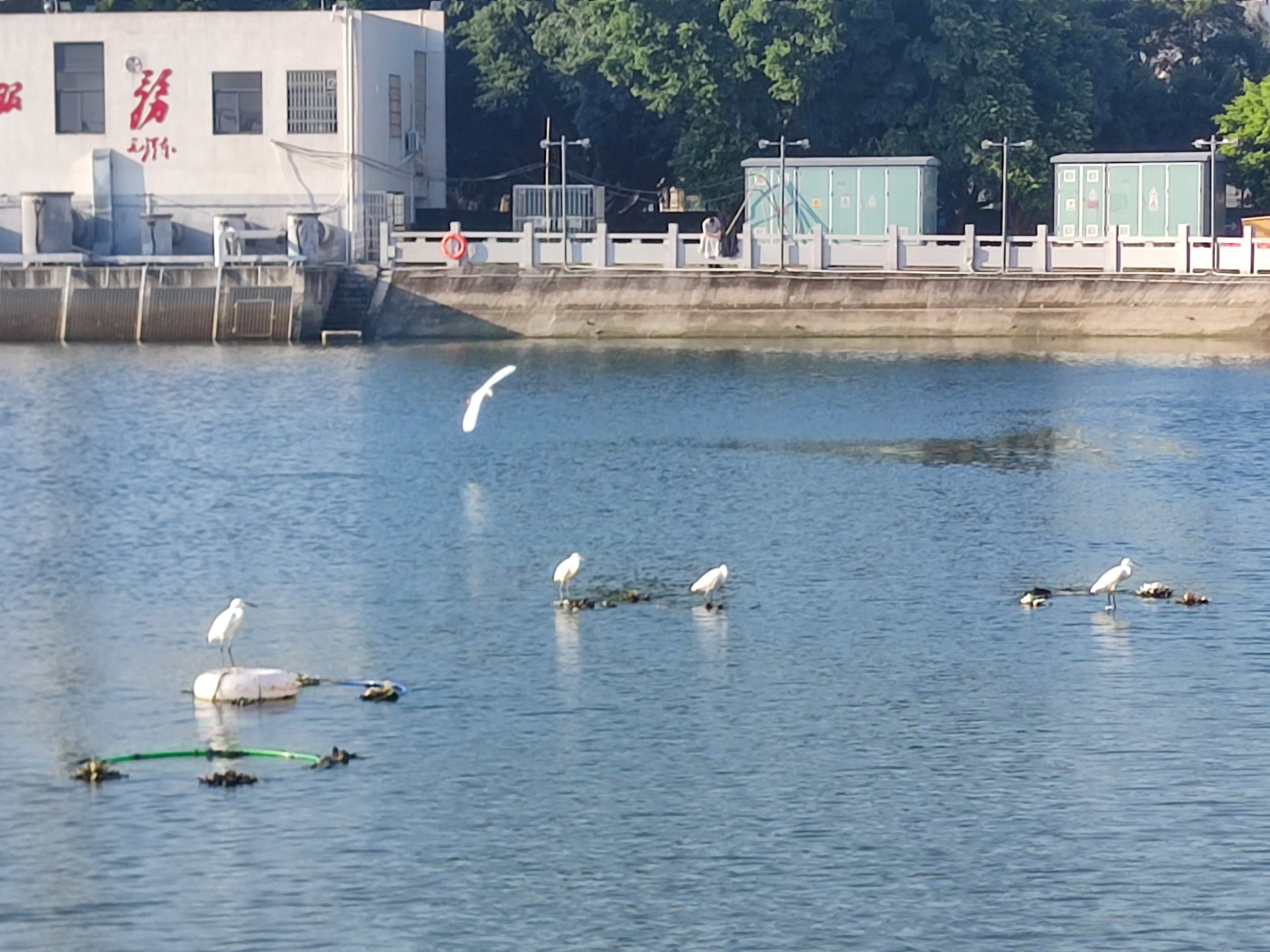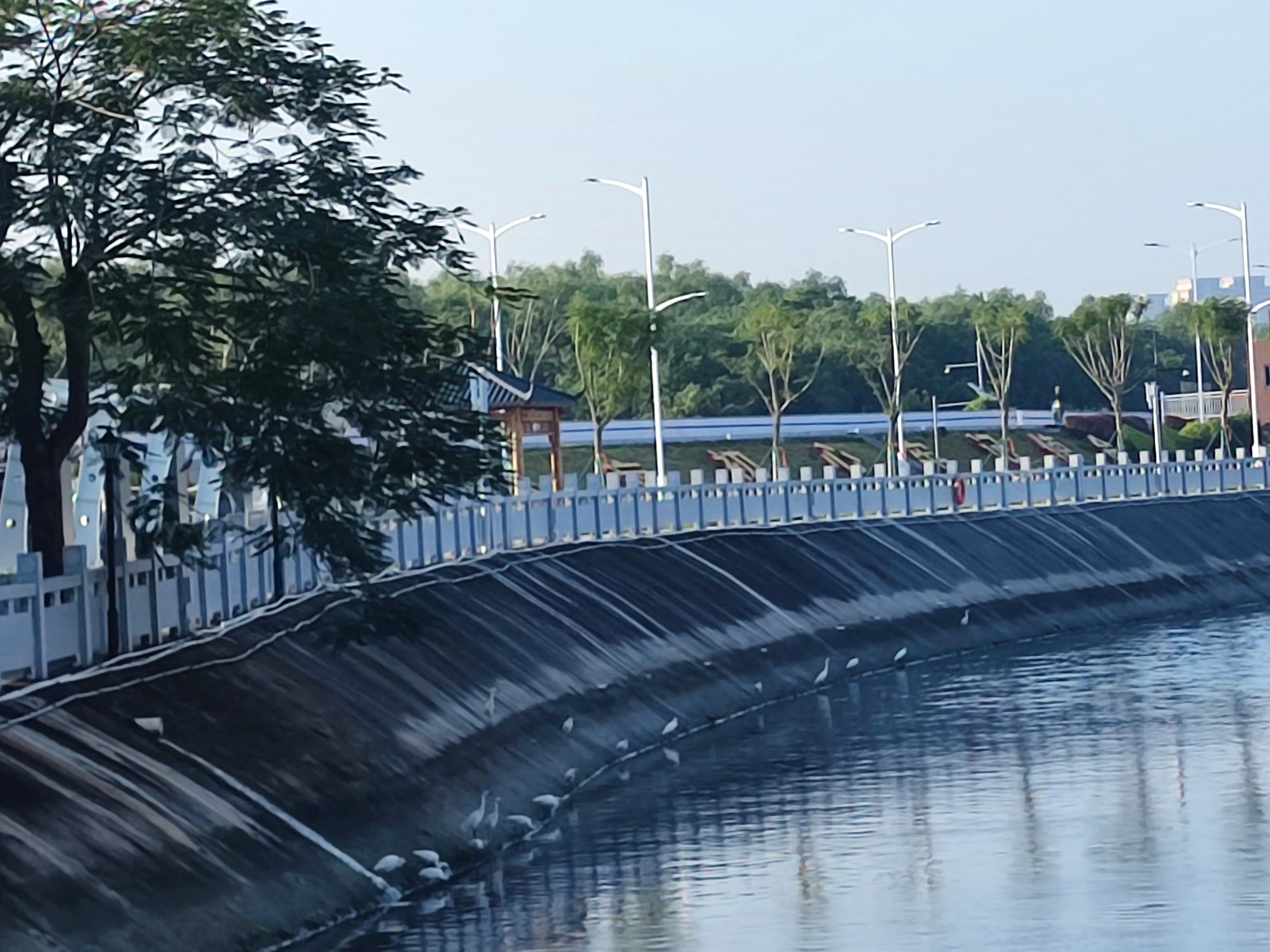 晨早也有点寒意,海堤路与那边的东阳北街早已车来车往人来人往,东湖的两个湖面上偶有白鹭等鸟在戏嬉飞翔觅食~等等~两个湖的颜色不一样是时间差与反光作用~?