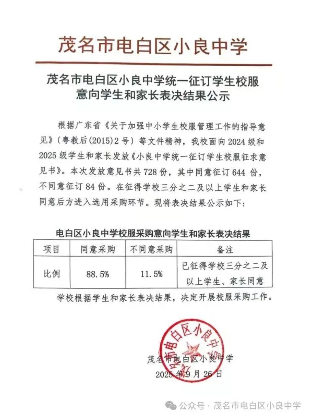 再看告知书中提及的校服采购依据,虽罗列了茂名市电白区教育局相关方案及多份文件,但文件的“合规性”却难掩执行中的“漏洞”。一方面,“由学生、教师及家长代表选定校服样式”的表述模糊,家长代表如何产生、是否真正代表多数家长意愿,均未明确说明,这为采购过程中的“暗箱操作”留下空间;另一方面,“全过程接受监督”的承诺缺乏具体可操作的监督机制,家长既无法参与采购价格的核算,也难以知晓中标厂家选择的详细流程,所谓“监督”沦为一纸空文。更值得警惕的是,“不买班级扣分”的隐性规定,本质上是将校服订购与班级考核挂钩,用行政权力施压家长,这种做法不仅背离了校服“培养集体荣誉感”的初衷,更扭曲了教育评价的导向,让“立德树人”的教育目标蒙上功利色彩。