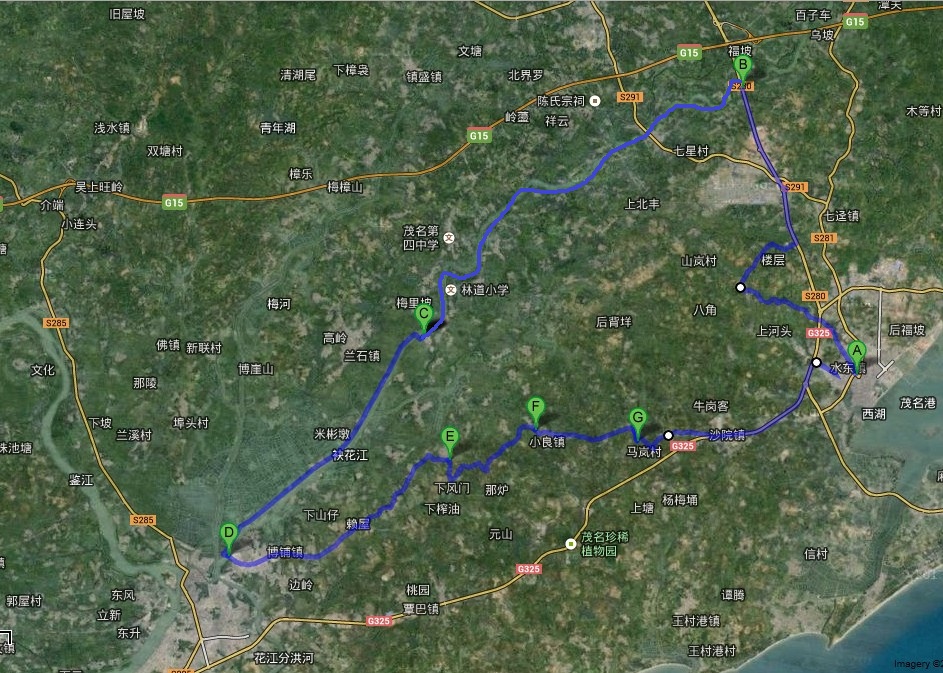 此次骑行袂花江沿岸行程为探索线路,路况未明,请有心骑友做足攻略,地图只作参考(但上面有标明的A、G、F为准确地点),全程约80公里。