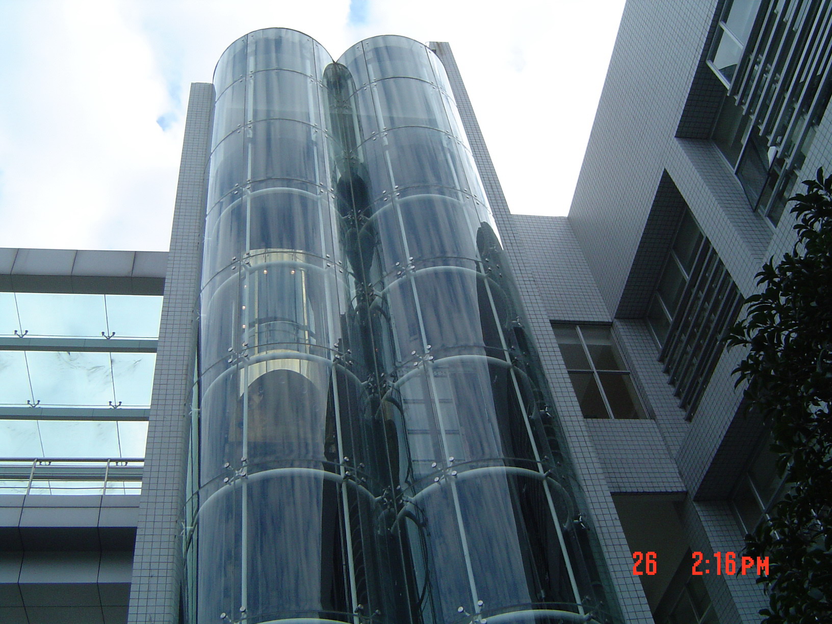 食堂里的透明升降电梯...拍摄的位置有个很大的鱼池..