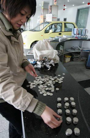 韩女士的先生说,平时,韩女士将钱捆好后,存放在家里的一个旧柜子里。天前,韩女士一家看中了一款价值3万9千8百元的轿车,准备买回家,用来送4岁大的女儿上幼儿园。 由于硬币只有3万4千9百元,昨日下午,韩女士又用现金补上了余款,并决定今日将新车开回家。