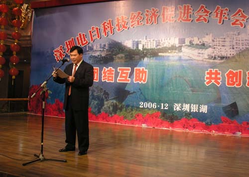 今天在即将送走果实硕硕的2006年,又豪情满怀地迎接即将到来2007年之际,在深圳创业的电白籍各界人士欢聚在银湖,隆重召开深圳电白科技经济促进会年会暨换届大会,这是在深圳的电白人共叙乡情、共谋发展的盛会,同时也产生了新一届联谊会领导组成人员。我相信,这对进一步增进乡情、加强沟通,促进发展,共同振兴电白都有积极的意义。在此,我谨代表中共电白县委、电白县人民政府对大会的胜利召开和新当选的领导成员表示热烈的祝贺!
