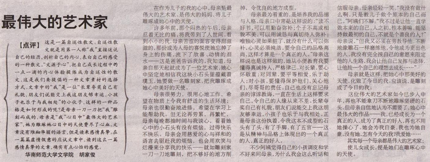 想说的是,自己离开高中近两年之久,看来确实是不会写考试作文了。不过,用心雕琢你的文章,同时也是在雕琢你的内心,你心中的天使。一个人心中总有一个天使,那么,你的那个天使在哪里呢?