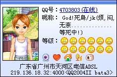QUOTE(yihatning @ Dec 20 2004, 12:41 PM) 海爷。。爱情对你来讲系饭出口入下面出皆。。。 爱情D野你手呒起噶啦。。认老算嗲啦。。 [snapback]129202[/snapback] 捞头,成日颠倒是非,捉你去塞头看守所反省! [attachmentid=5525]