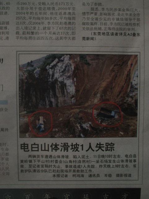 知情人介绍,塌方事故发生在十一日晚十时十五分左右,塌方前有一名守夜的工人在石场顶部临时搭建的工棚里休息,旁边还停有三辆东风翻斗车,底部同时停有三辆东风车和一台挖掘机。塌方后,守夜的工人失踪,四辆东风翻斗车及一台挖掘机被埋。