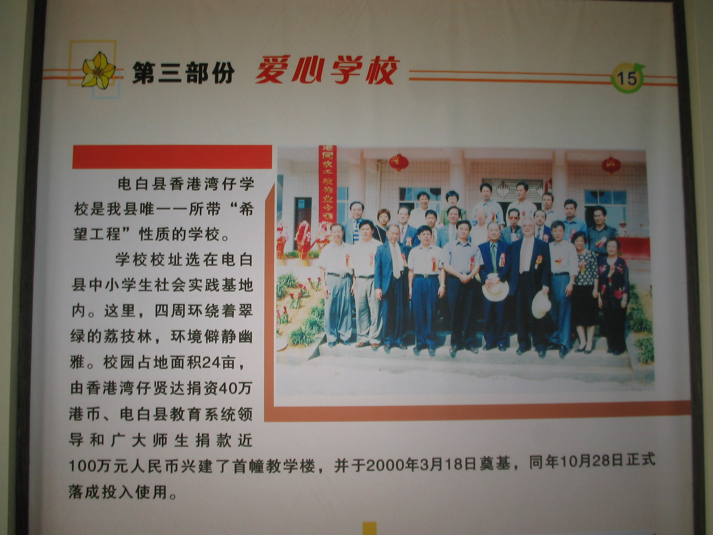QUOTE(四中乐叔 @ 2006年08月07日 Monday, 11:24 PM) 电白湾仔孤儿学校 [snapback]1423583[/snapback] www.dbtxw.com 发布时间:2006年06月20日09时00分 来源:茂名日报 今年父亲节前,电白香港湾仔学校的108名没有了父亲母亲的孤儿学生迎来了一群特殊的“父母亲”――来自特区的20多名“深圳爸妈”和孤儿学生一起促膝谈心,谈生活、谈学习、谈理想。“深圳爸妈”还现场为孤儿捐了一大笔钱,使孤儿们度过了幸福快乐的一天。 电白香港湾仔学校是一所“爱心学校”,由香港湾仔各界社会贤达(大部分为电白籍人)捐资40万港币、电白县教育部门领导和广大师生捐款近100万元人民币合力建成,于2003年开始招收孤儿学生。这些孤儿在校的学习及生活费用全部由教育部门设立的“扶孤助学”基金及社会热心人士捐助解决。目前,该校有3个教学班108人,学生全部为没爹没妈、无依无靠的孤儿。 该校自创立以来,得到社会各界热心人士的鼎力支持和热心帮助。深圳市龙岗区企业家联合会、深圳电白乡亲联谊会会长廖寿伦先生就是其中一位。今年3月,廖先生曾两次带领深圳电白乡亲联谊会的企业家到该校慰问孤儿,共向孤儿捐赠了6万元钱和4台电脑、1套音响。父亲节前夕,廖先生惦记着这群无父无母的孤儿,再次带领深圳龙岗区企业家联合会、关心下一代工作委员会的人员及该区热心人士一行20多人(大部分为做了父亲母亲的人士),专程来到湾仔学校,亲切看望孤儿。当日,“深圳爸妈”们与孤儿围坐在一起,亲热得就像一家人。在详细了解了孤儿们在校的学习与生活情况后,在廖寿伦先生的倡议和带头下,进行了现场捐款,共捐集爱心款29000元,并当场将这笔款捐赠给了学校,用于孤儿的学习与生活。捐赠仪式上,廖先生表示,今后还将介绍更多的深圳企业和企业家到学校认养孤儿;对学习成绩优秀、考上县重点高中的孤儿,将资助其读高中,甚至大学;对初中毕业想就业的孤儿,将积极联系深圳企业,安排其就业,解决孤儿的生活出路问题。(记者 梁爽 通讯员 张宁)
