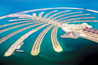 在14000多名工人历经5年夜以继日的苦干加巧干后,花费140亿美元打造的全球首个棕榈叶形状的岛屿―迪拜“朱美拉棕榈岛”初具规模,首批4000位岛民有望今年11