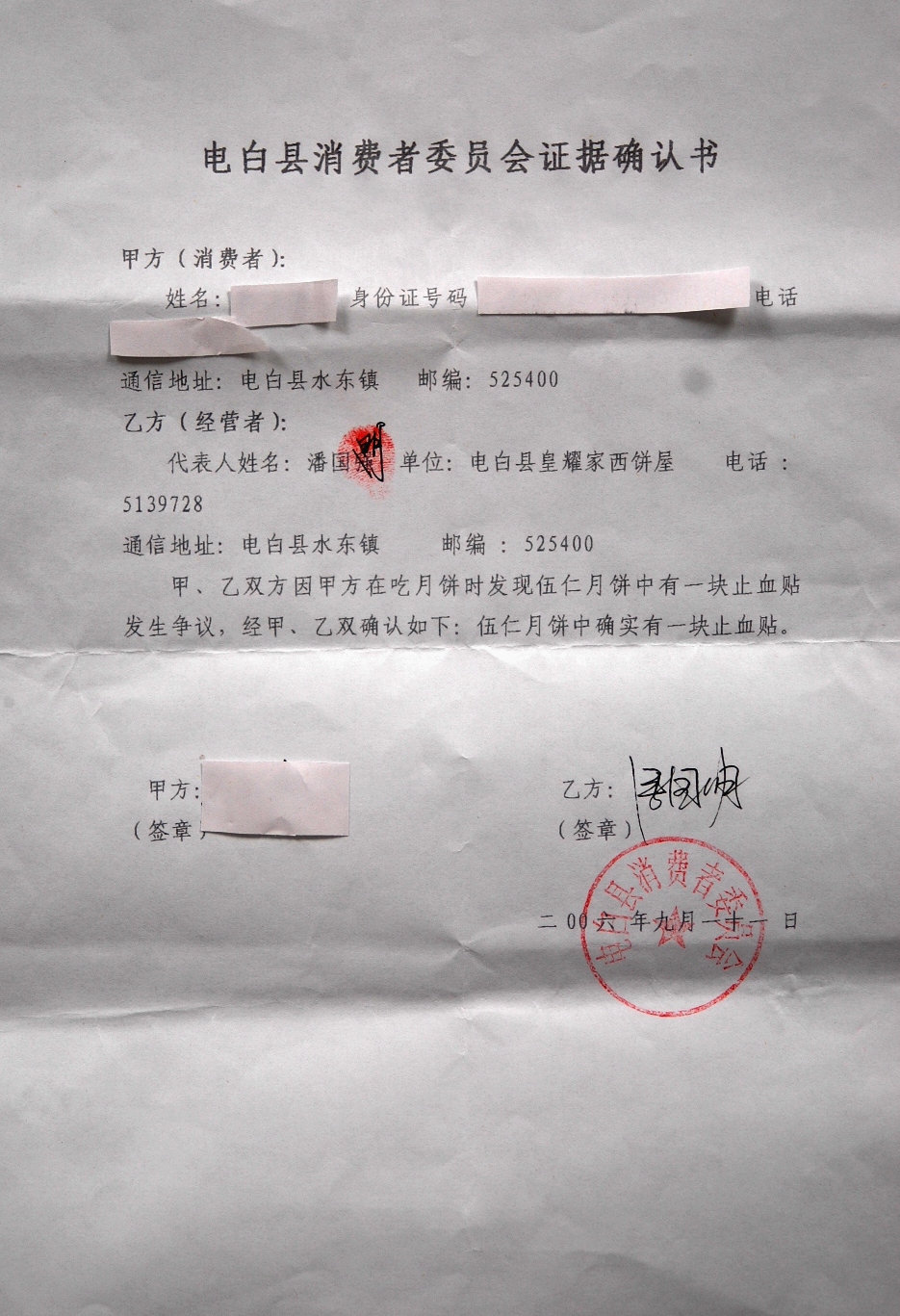 首先非常感谢楼下那么多朋友的支持!我可以郑重声明:此事绝无虚假!我本来就不是一善于灌水的人,只是这件事上实在欺人太甚!忍无可忍才上来一说。刚给家里打过电话,说去茂名市消委会问确认书的法律效力,没有人理,叫姐姐等电话回复,却一直没有回音,打去问居然说要等又某一主任才知!多可笑!至于质疑我说的是否属实,我想我会应你们的要求,现在把月饼的照片传上来和确认书扫描上来,居于对家人的保护,把姐姐的签名隐藏了。