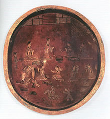 三国(吴)。盛食器,直径24.8厘米、高3.5厘米,木胎,盘内壁及底髹红漆,外壁及底髹黑红漆,内外颜色有区别。漆盘内的画面分为三部分:上面为宴宾图;下面为出游图;中间部分又包括三个画面:右侧为驯鹰图、中间为对弈图、左侧为梳妆图。1984年安徽马鞍山朱然墓出土。现藏于:马鞍山市博物馆 。