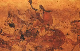 北齐。《鞍马出行图》位于墓道西壁中栏、作长卷式展开:风嗖嗖,旗猎猎,远征的人儿出发了!莫道行程远,何惧路奇艰,手执弓,身佩剑,扬锐气,策骏骑,纵然千山万水,也要勇往直前。马嘶鸣,回首望,召唤身后的马队,快加鞭,紧跟上,越过前方的大山,将是我们的猎场……整个画面层次分明,构图新颖,人物生动,表情逼真,生活气息浓厚,表现技法娴熟,堪称中国绘画史上的精绝之作。现藏于:山西省考古研究所。