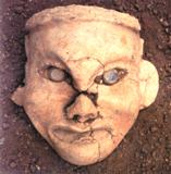 新石器时代晚期。红山文化的一个重要发现是牛河梁的女神庙。庙址由南、北两组建筑组成,其中北组为主体建筑,南北十八米余,东西宽近七米。墙壁经过彩绘,室内发现有大量的人物塑像碎块,有头、肩、手以及乳房等部位的残块,均属女性。头部真人大小,面涂红彩,双眼镶嵌青色玉片。这是中国最早的女神像。现藏于:辽宁省考古研究所。