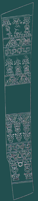 商代。通长54.5公分,遍体满饰图案,生动刻画了原始宗教祭祀场面。图案上下两幅对称布局,内容相同,最上一幅平行站立三人,头戴平顶冠,戴铃形耳饰,双手在胸前做抱拳状,脚穿翘头鞭,两脚外撇站成一字形。第二幅是两座山,山顶内部有一圆圈(可能代表太阳),在圆的两侧分别刻有“云气纹”,两山之间有一盘状物,上有飘动的线条状若火焰。在山形图案的低部又画有一座小山,小山的下部是一方台(可能代表祭祀台),山的外侧,一只大手,仿佛从天而降,伸出拇指按在山腰上。第三幅是两组S形勾连的云雷纹。云雷纹下的一幅也是三个人,穿着和手势与第一幅相同,所不同的是这三个人戴着山形高帽,双脚呈跪拜的姿势。第五幅又是两座山,内部结构与第二幅相同,所不同的是山外两侧各立有一牙璋,右边的山头伸出一个状若象勾状物横在两山之间。这些图案反映出古蜀人在祭坛上举着牙璋祭祀天地和大山,而且天神已有反应,伸出拇指按在山腰上,这是要赐福于下界的表示。三星堆遗址出土。现藏于:四川省考古研究所。