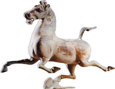东汉。此马高34.5厘米,长45厘米,其造型巧妙地利用了力学支点,铸造了风驰电掣的千里马形象。马作飞驰状,高昂首,尾上扬,口张作喘息状,3足腾空,右后足正巧踏在一只疾飞的燕背上。那只奋飞的燕子在翱翔中突遭马蹄踏中脊背,霎那间吃惊地回首反顾;似要看清那比它还快的庞然大物,而奔马也头稍左顾,好象也要弄清踩着了什么东西。奔马与飞燕在这一瞬间的动作被表现得淋漓尽致。古代的艺术家设想出如此浪漫、巧妙、引人入胜的意境,烘托、反衬出骏马的神速,实在令人拍案叫绝!1969年在甘肃武威雷台的东汉墓中出土。现藏于:甘肃省博物馆。