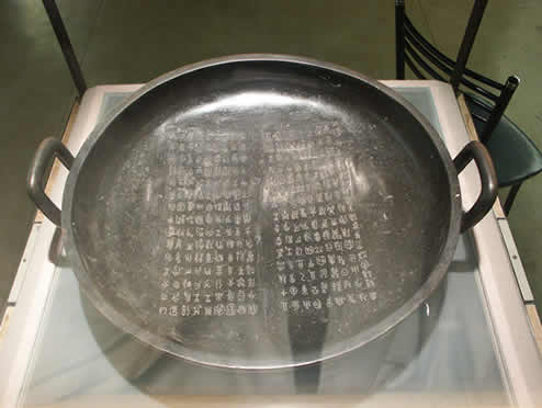 西周中期。微氏家族器具,通高16.2厘米,口径47. 3厘米,深8.6厘米。史墙盘是西周微氏家族中一位名叫墙的人,为纪念其先祖而作的铜盘,因作器者墙为史官而得此名。盥洗器,此盘造型规整,纹饰精美,敞口,浅腹,圈足,腹外附双耳;腹部饰凤鸟纹,圈足部饰两端上下卷曲的云纹,全器纹饰以云雷纹衬地,显得清丽流畅。盘内底部刻有18行铭文,共284字,记述西周文、武、成、康、昭、穆六王的重要史迹以及作器者的家世,这是新中国成立以来发现的最长的一篇铜器铭文。铭文首先追述了列王的事迹,历数周代文武、成康、昭穆各王,并叙当世天子的文功武德。铭文接着叙述自己祖先的功德,从高祖甲微、烈祖、乙祖、亚祖祖辛、文考乙公到史墙。颂扬祖先功德,祈求先祖庇佑,是典型的追孝式铭文。人们从微氏家族的发展史中,可看出周王朝对殷商遗民采取的政策。1976年陕西扶风庄白家村出土。盘铭也是一篇很漂亮的书法作品,其文体爱用简明整齐的四字句式,这是已知时代最早的带有较明显骈文风格的铭文作品。现藏于陕西省周原扶风文物管理所。