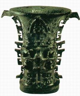 西周。高39厘米、口径28.6厘米、重14.6公斤。口圆体方,通体有四道镂空的大扉棱装饰,颈部饰有蚕纹图案,口沿下饰有蕉叶纹。整个尊体以雷纹为底,高浮雕处则为卷角饕餮纹,圈足处也饰有饕餮纹,工艺精美、造型雄奇。铜尊内胆底部发现了一篇12行共122字的铭文,记载了周成王营建洛邑,建筑陪都的重要历史事件,极具史料价值,而其中“宅兹中国”(大意为我要住在天下的中央地区)更是“中国”最早的文字记载。1963年出土于陕西省宝鸡市东北郊的贾村。现藏于:陕西省宝鸡市青铜器博物馆。