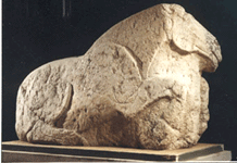 西汉。长274,宽220厘米,依石块自然形态就势刻划,怪兽的眼与嘴透露着凶残和贪婪,线条简练准确,用线雕勾勒出怪兽的前肢,用石面自然形状表现羊身上的肌肉,羊在怪兽中挣扎的痛苦表情,通过前蹄的用力和肌肉的抽搐,形象地再现出来,结构十分巧妙,形成紧张恐怖的气氛,产生出一种强烈的艺术感染力。现藏于:茂陵博物馆。