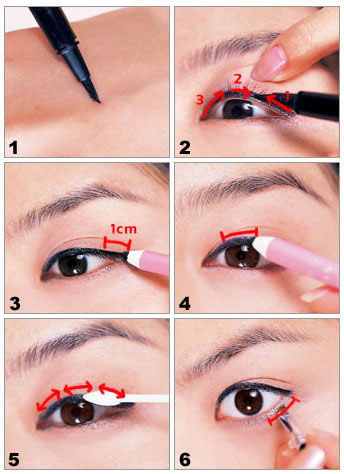 Step 2:手指将眼皮向上撑开,清楚的看到睫毛的根部,从眼尾-->眼中-->眼头,分2段描出眼线。