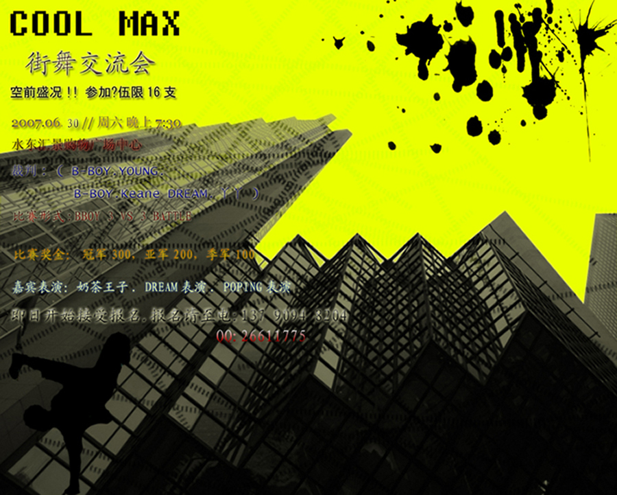 【 COOL MAX.街舞交流会 】 裁判: ( B-BOY.YOUNG. B-BOY.Keane DREAM.丫丫 ) 比赛时间:6月30日 晚上 7:30 比赛场地:水东汇景购物广场中心. 比赛形式:BBOY 3 VS 3 BATTLE ( 参加队伍限16支 ) 嘉宾表演:奶茶王子. DREAM表演. POPING表演 比赛奖金: 冠军300,亚军200,季军100 即日开始接受报名.报名请至电:137 9094 8204 QQ:26611775.